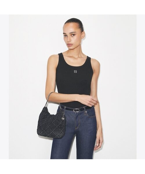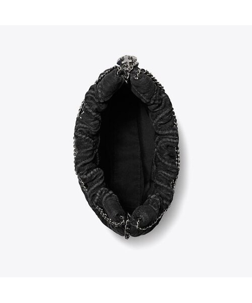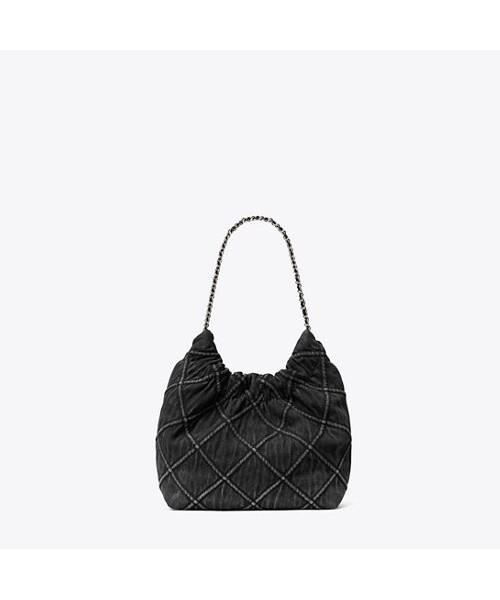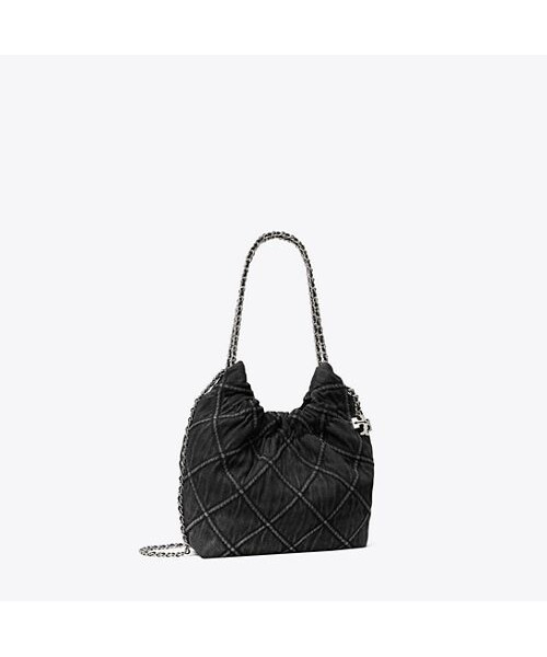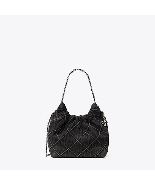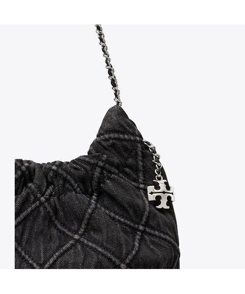 토리버치만의 매력이 돋보이는 플레밍 미니 호보백입니다. 트렌디하면서도 페미닌한 분위기를 자아내는 호보 디자인의 미니백으로, 보기 보다 여유로운 수납력으로 데일리하게 사용하기 좋습니다. 크로스바디 체인 스트랩을 가방 안쪽에 넣어 탑핸들백으로도 연출이 가능하며, 캐주얼하면서도 시크한 무드의 블랙 데님 소재로 제작되어 더욱 멋스럽습니다.