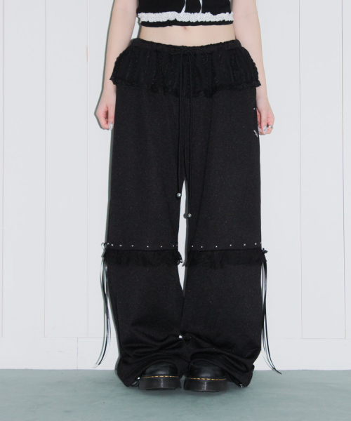 - 쉬어 소재를 사용한 프릴 웨이스트 밴딩으로 힙하고 키치한 실루엣 연출