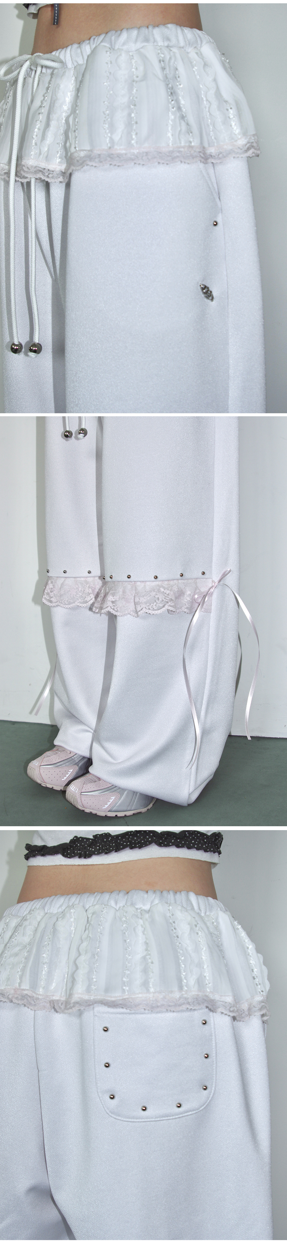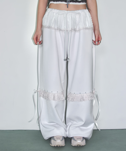 - 쉬어 소재를 사용한 프릴 웨이스트 밴딩으로 힙하고 키치한 실루엣 연출