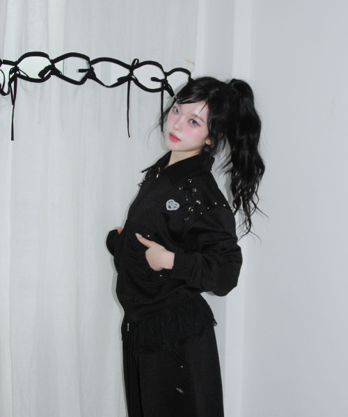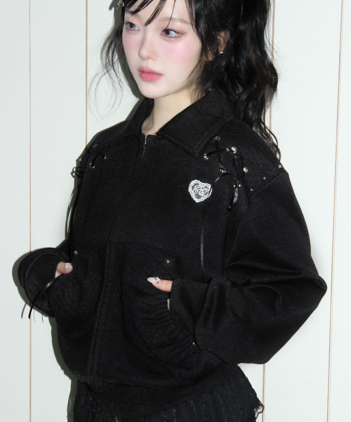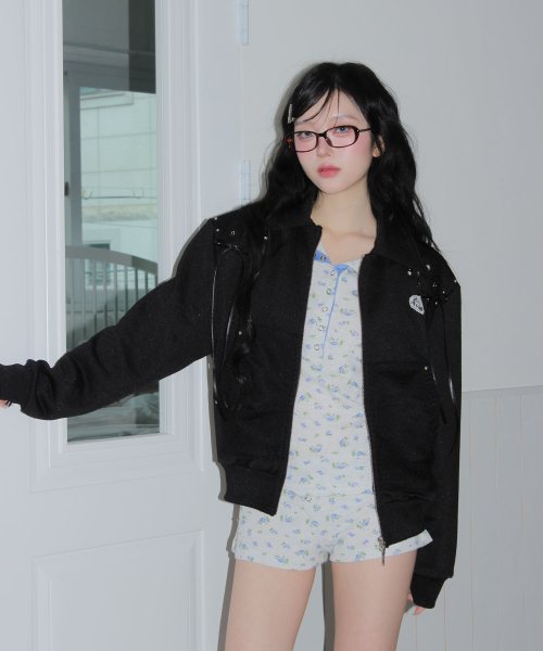 - 광택감이 느껴지는 쮸리 소재로 제작한 져지 타입의 집업 점퍼