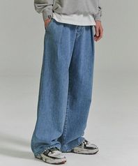 Banding One Tuck Wide Denim Pants - Deep Blue
