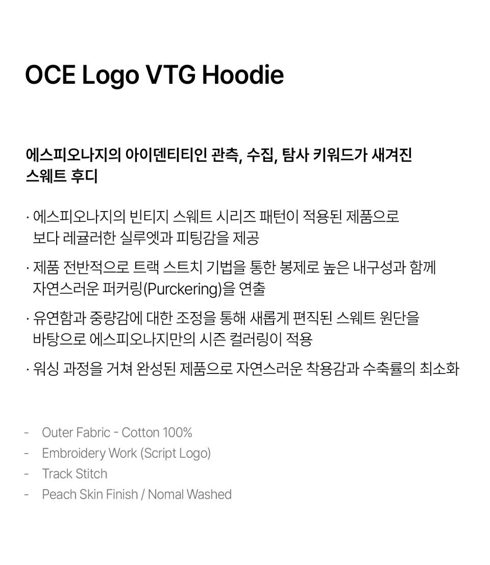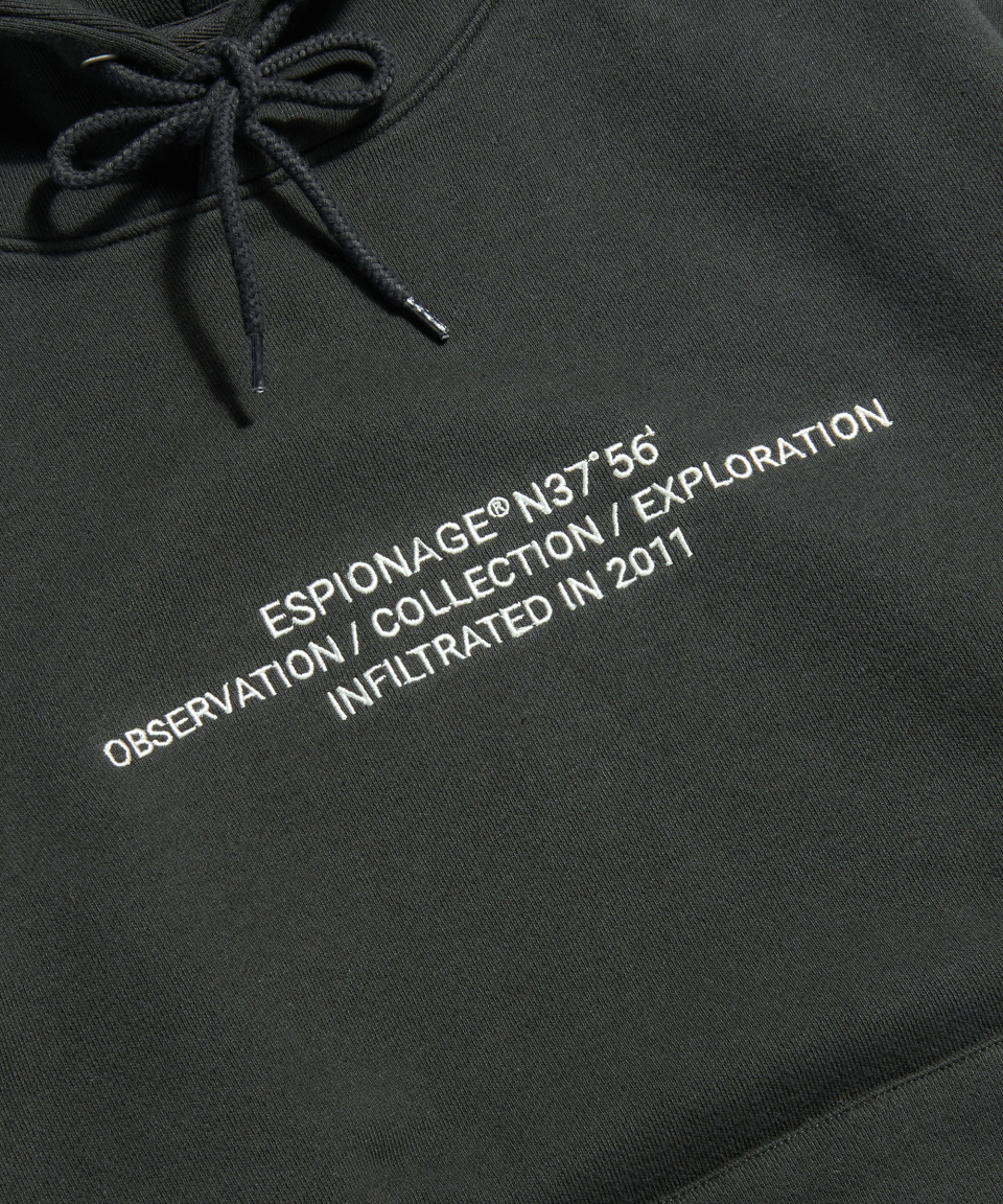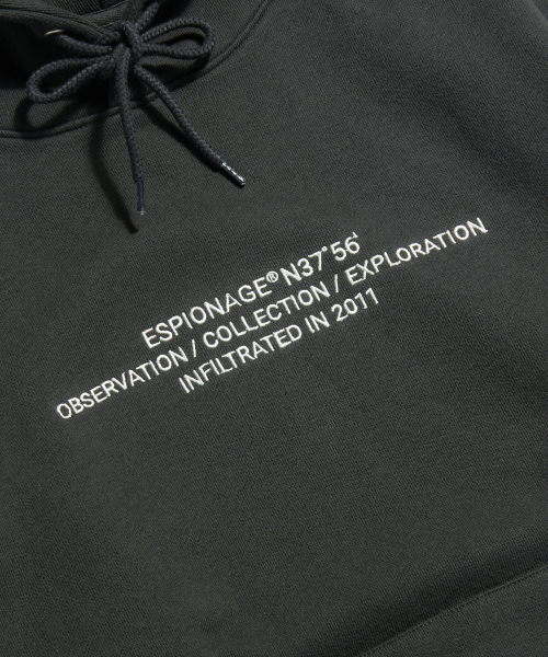 에스피오나지(ESPIONAGE)는 '밖을 보다' '숨겨져 있는 것을 발견한다'는 의미의 고대 프랑스어 ESPIRE에서 유래한 말로 지금은 타국의 비밀 정보를 수집하는 첩보 활동을 뜻하기도 합니다. 첩보 활동의 의미가 적진에서 은밀히 적들의 정보를 빼오는 것을 말하는 것처럼 에스피오나지가 만드는 아이템에는 숨겨져 있는 것을 찾아내는 과정을 포함하고 있습니다. 클래식, 밀리터리, 아웃도어 등 이미 만들어져 있는 의복을 베이스로 우리가 중요하게 생각하는 원단과 부자재, 기술, 핏 등의 요소들을 정확하게 탐구하고 수집해 조합, 재정의 혹은 재해석된 결과물을 만들고자 합니다. 사전적인 의미의 에스피오나지가 가지는 부정적인 첩보 활동의 이미지가 아닌 첩보 활동의 과정, 즉 본질에 대한 탐구와 조사 활동이라는 긍정적인 느낌을 전달하려 하며 수집된 정보를 하나의 작업물로 만들어내는 일련의 과정과 그렇게 완성한 에스피오나지의 아이템을 통해 다시 만드는 과정을 다시 유추하려는 생각들 모두 에스피오나지입니다.