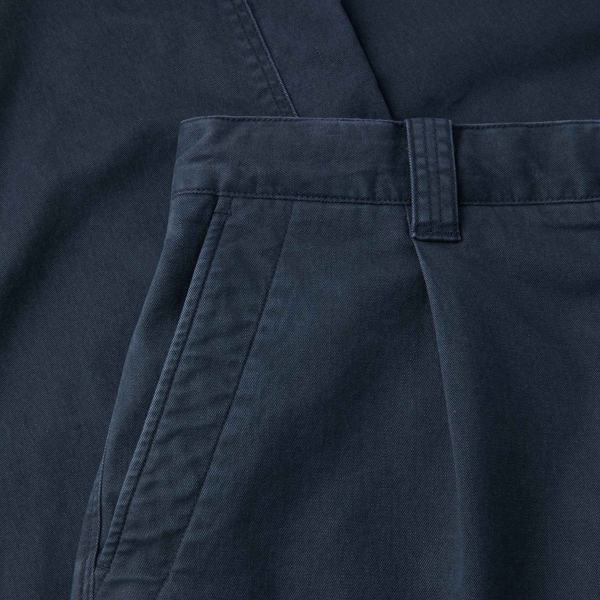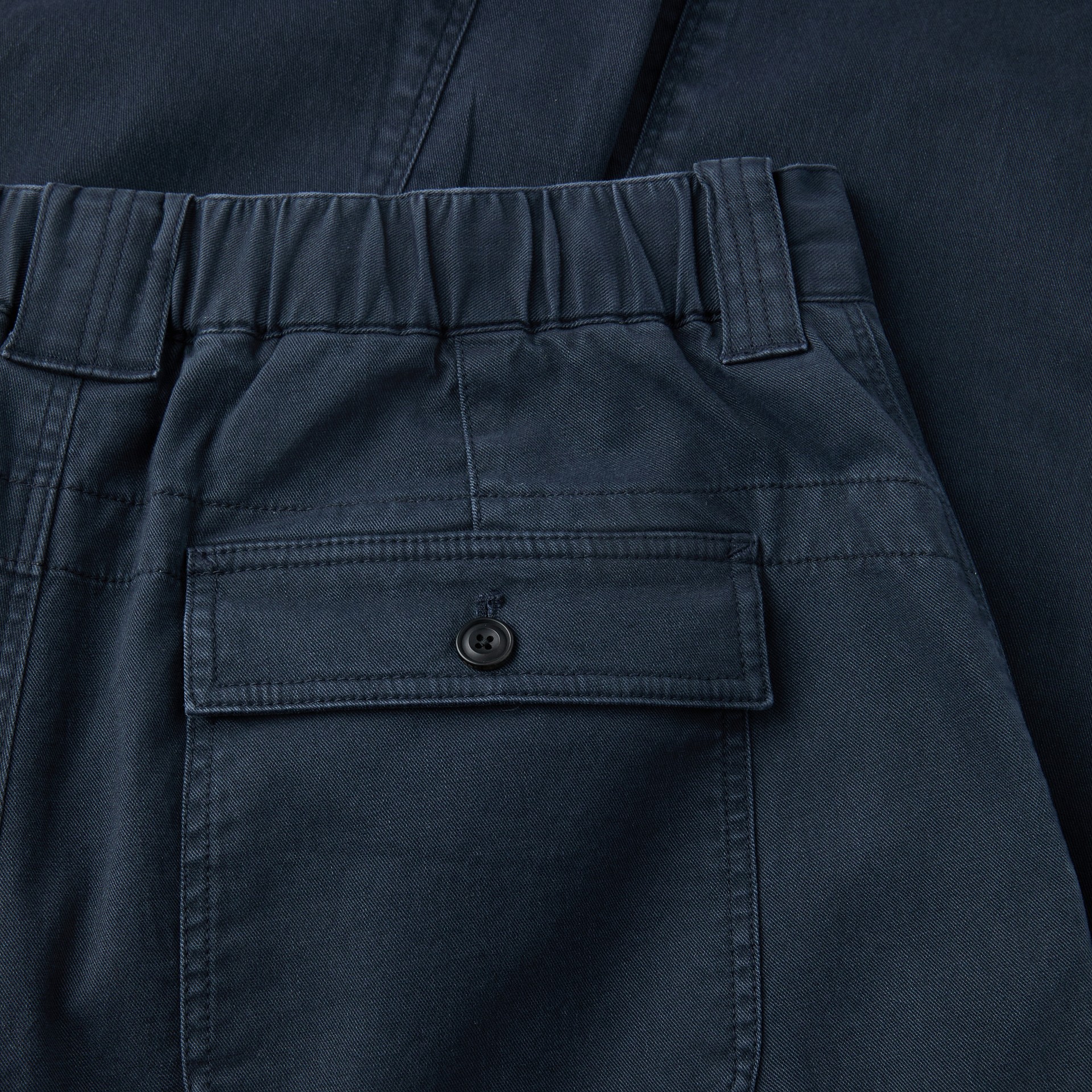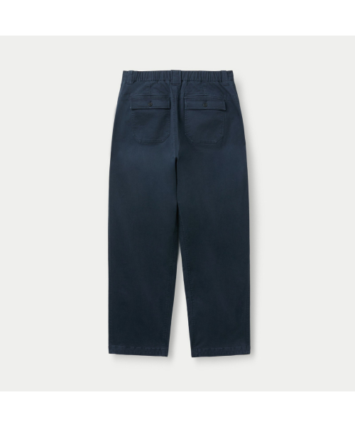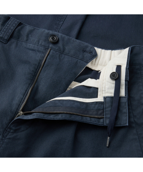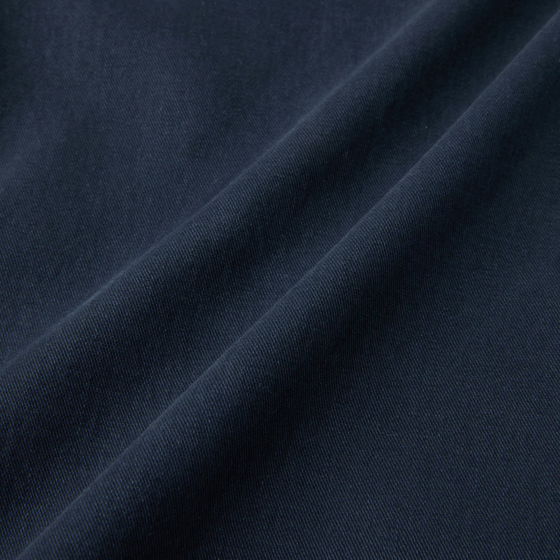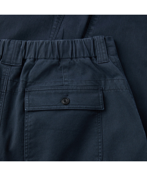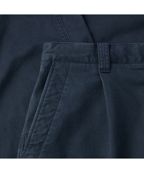 신축성이 있는 코튼 소재에 카치온 가공으로 편안한 착용감과 빈티지하고 네츄럴한 외관이 특징.