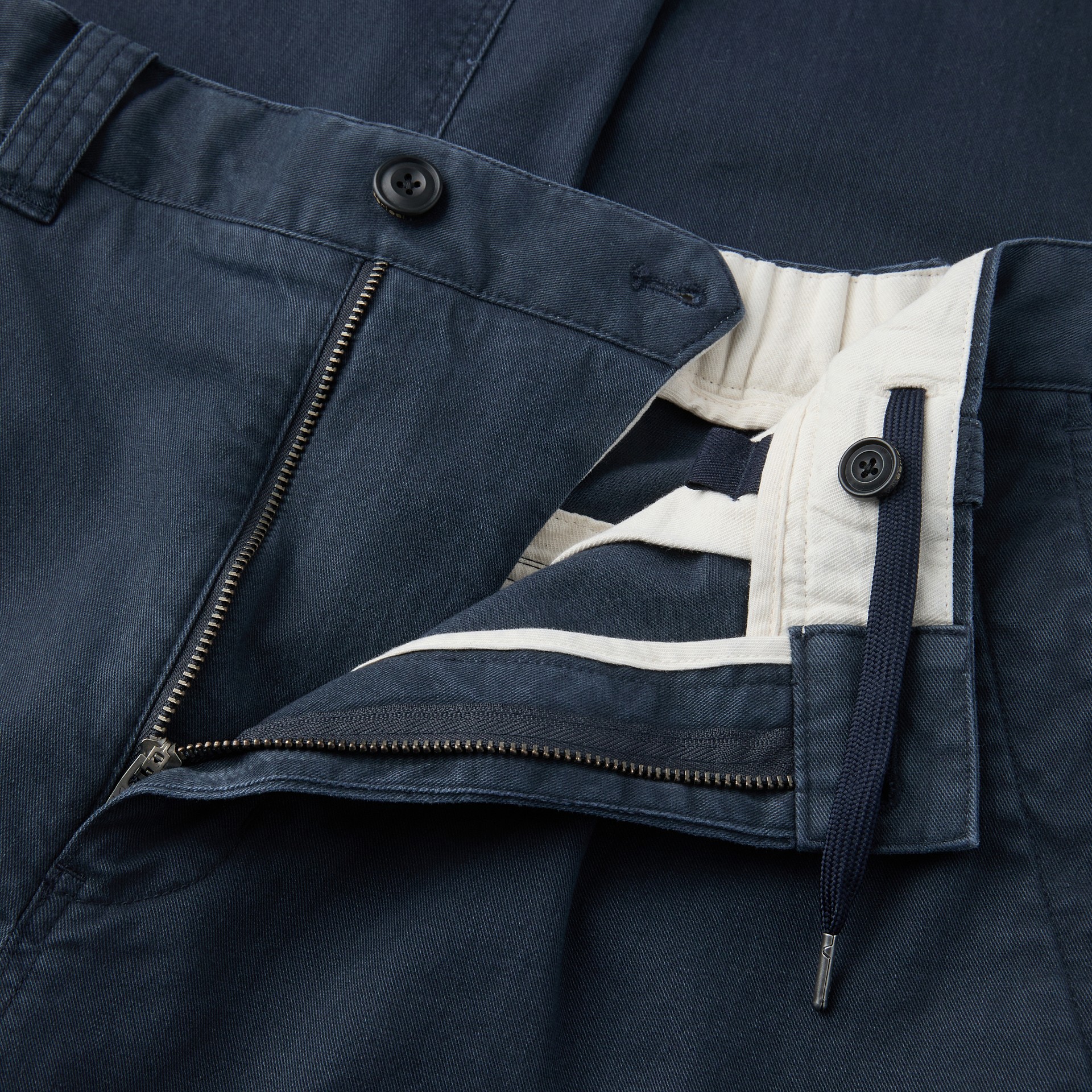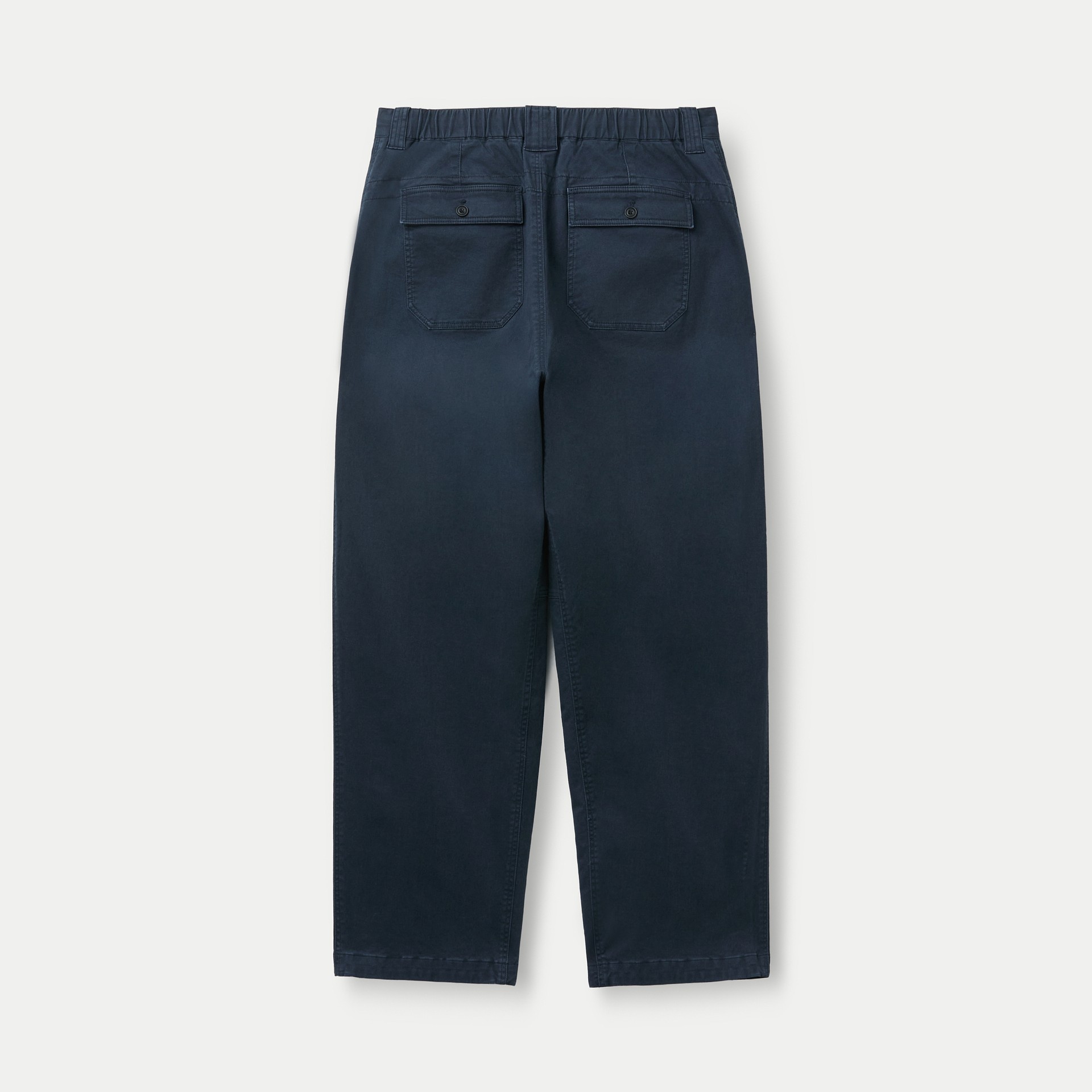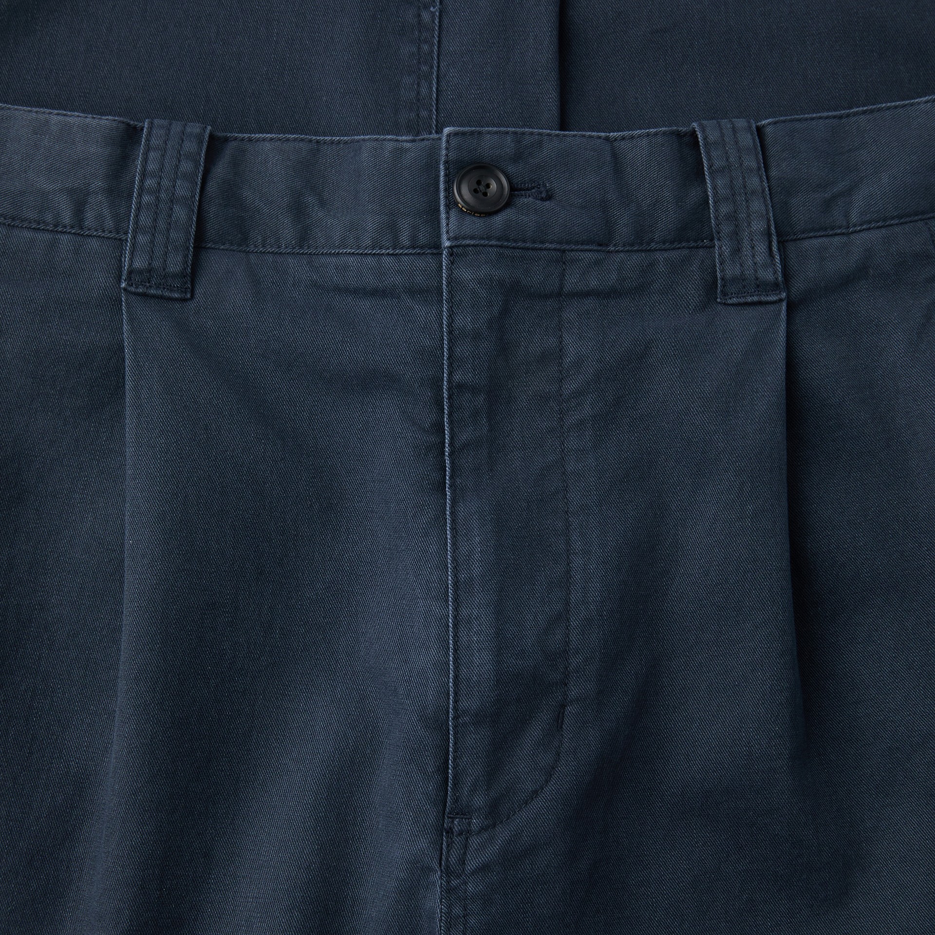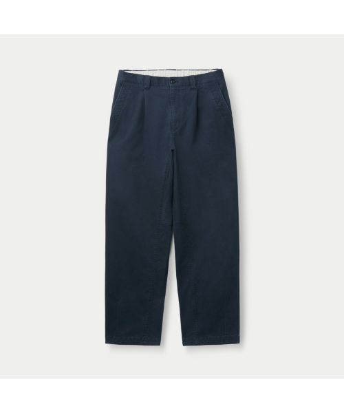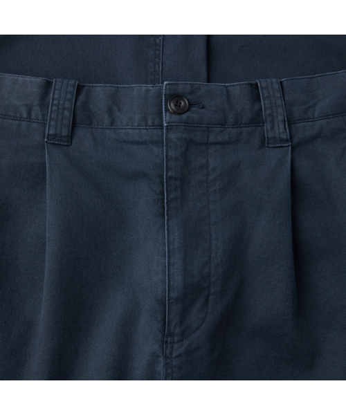 신축성이 있는 코튼 소재에 카치온 가공으로 편안한 착용감과 빈티지하고 네츄럴한 외관이 특징.