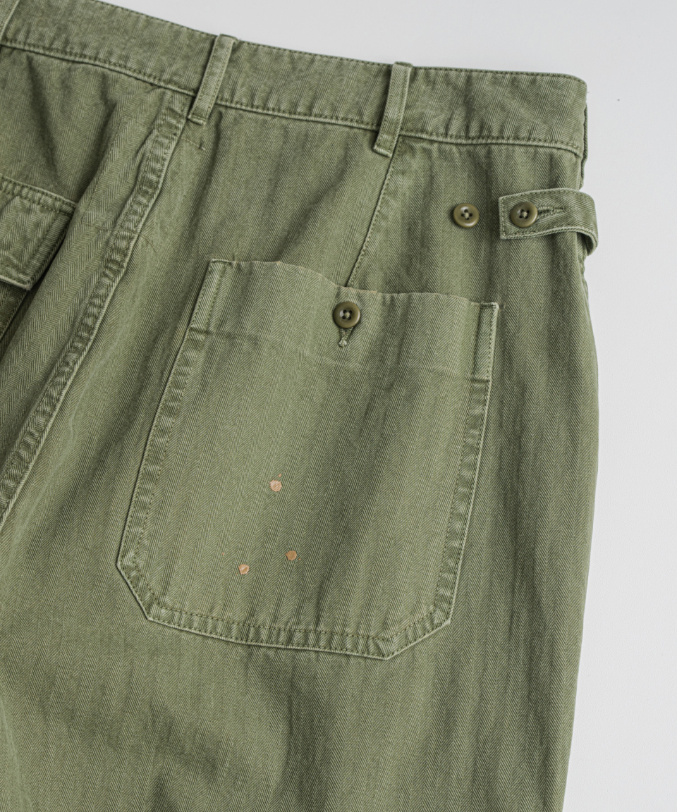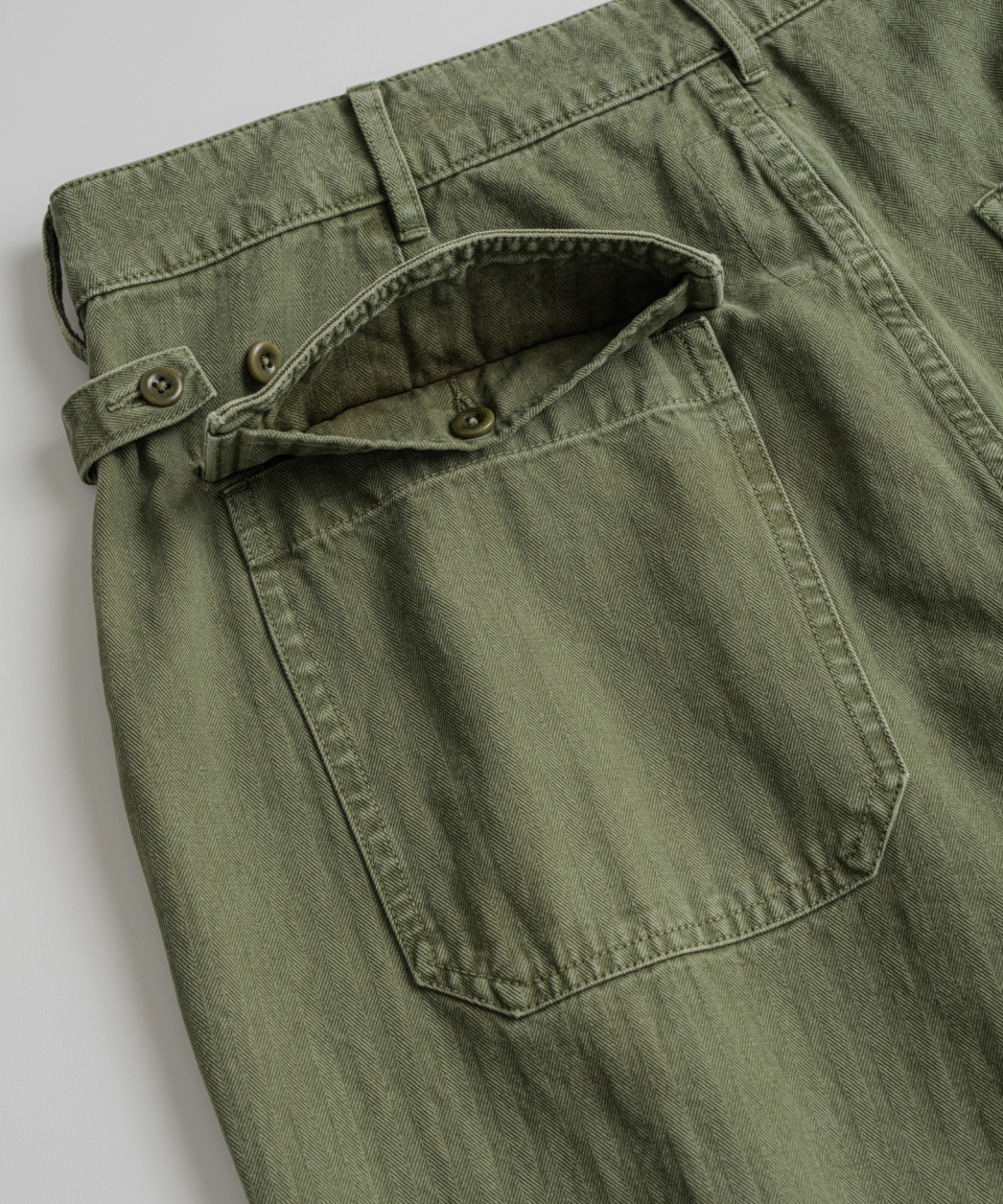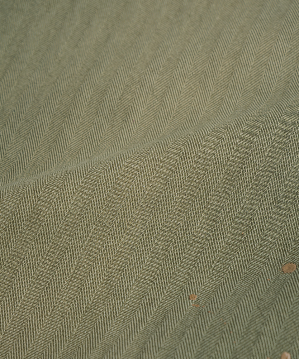 조직이 청어의 뼈를 닮아 이름 붙여진, 헤링본 트윌 패브릭을 사용했습니다. 두껍지 않으면서도 특유의 질감과 뛰어난 내구성을 지니는 것이 특징입니다. 완성 후 황화염색(Sulfur dyeing) 공정과 페인팅 공정을 거쳐 짙은 색조와 빈티지한 질감을 표현했습니다, 자연스럽게 바랜 듯한 깊은 세월의 흔적을 표현했습니다.