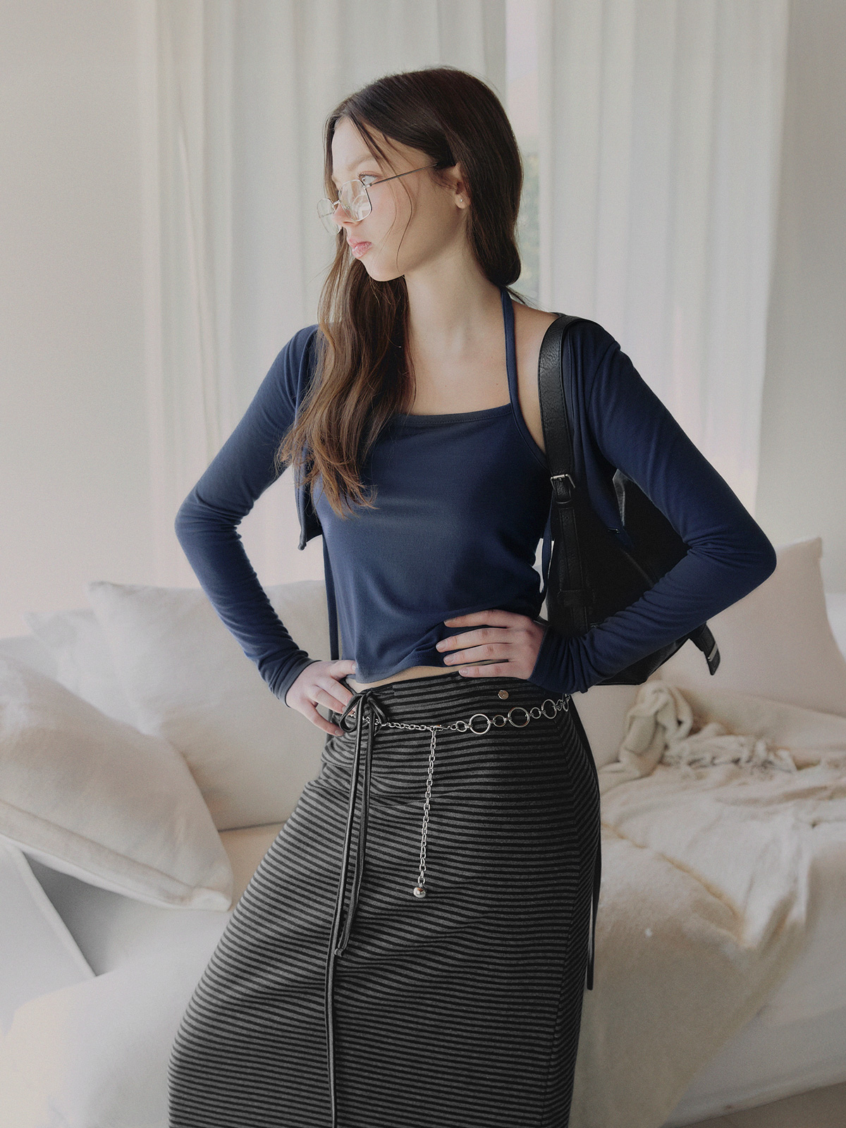 르벨 시스루 카라 골지 긴팔 티셔츠