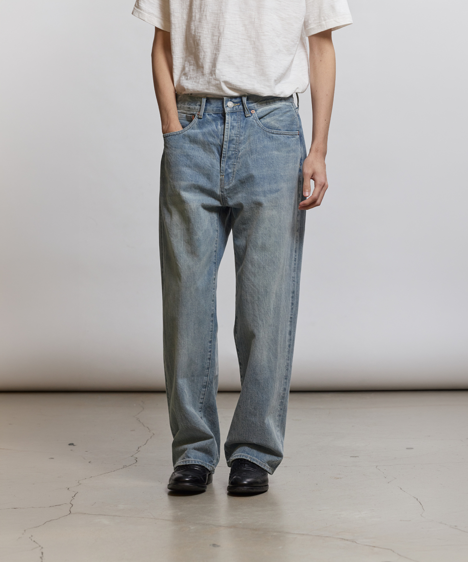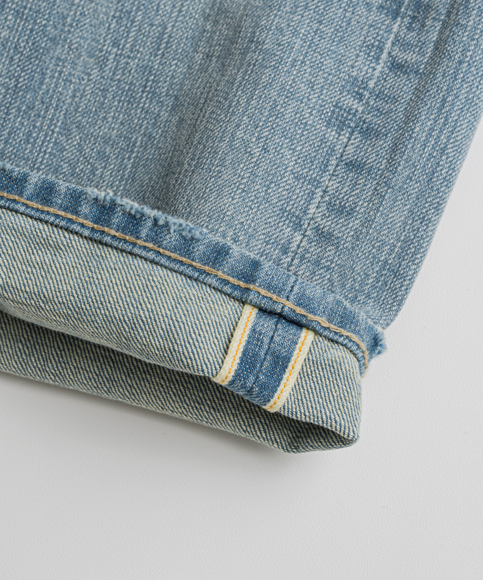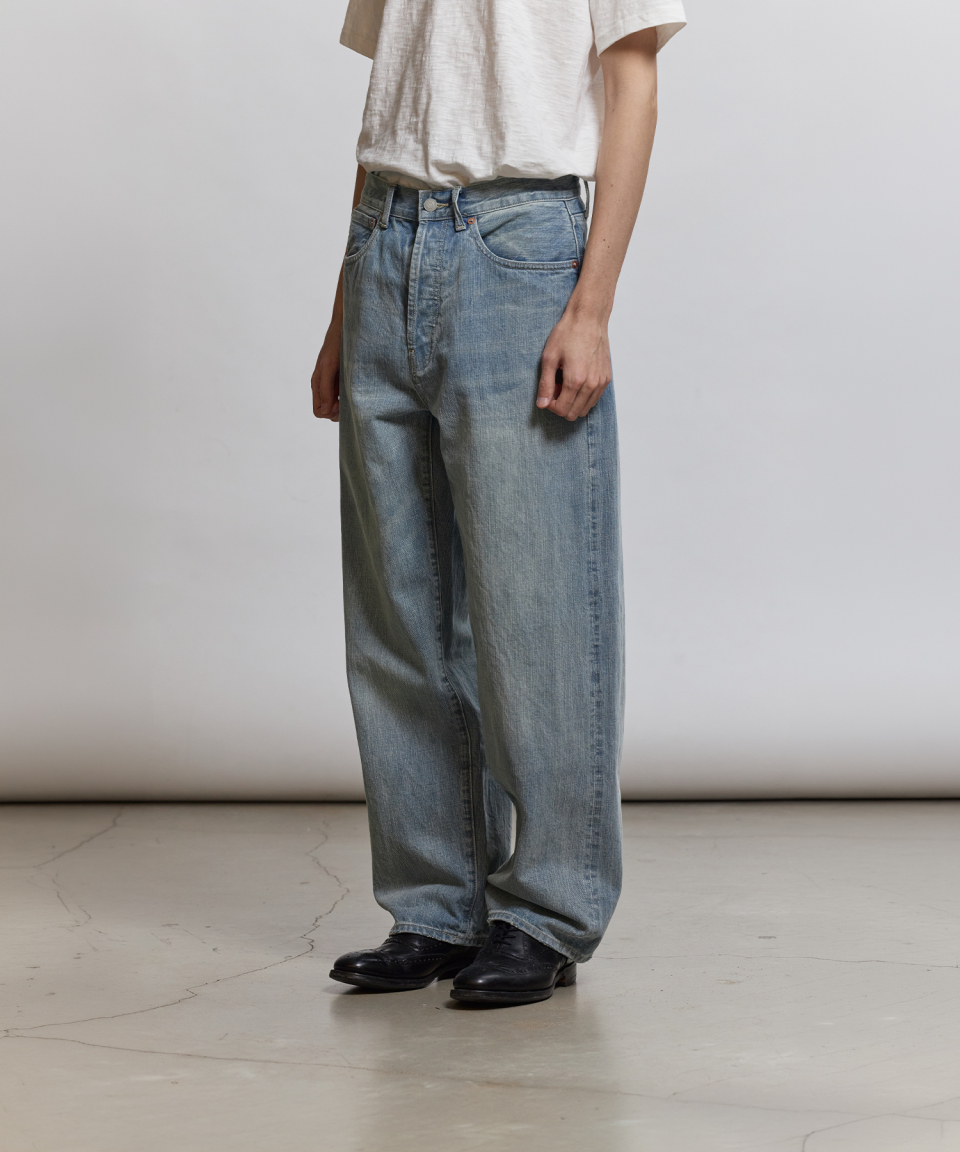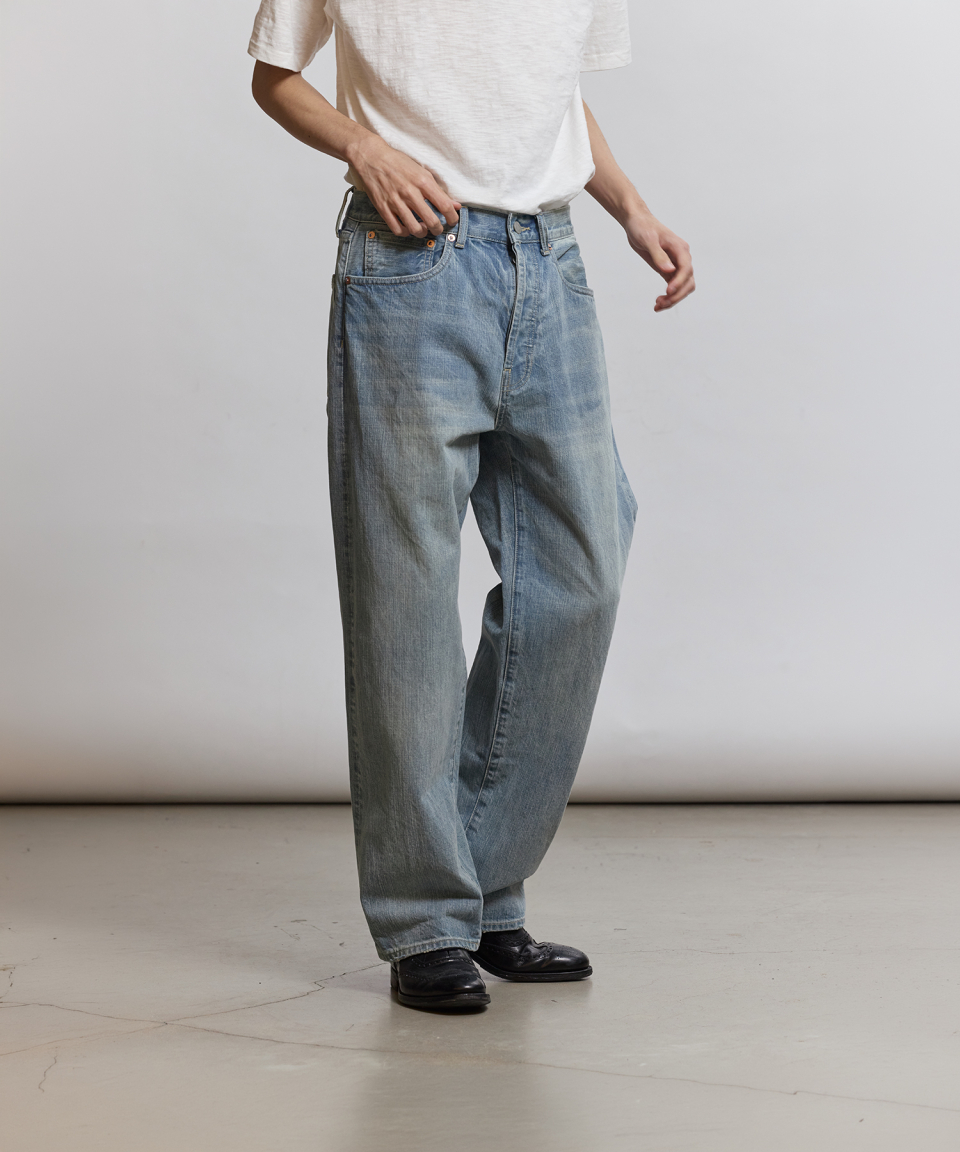 1930년대 와이드한 실루엣의 데님을 구현하기 위해, 미면사를 TOYODA社 셔틀 직기 방식 직조하여 구현된 14oz 셀비지 데님 팬츠입니다.