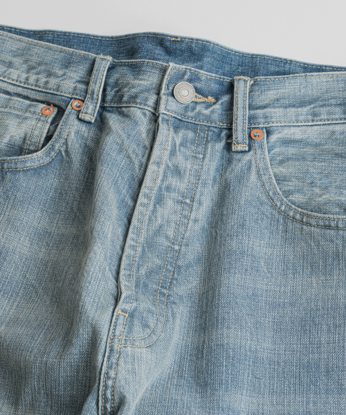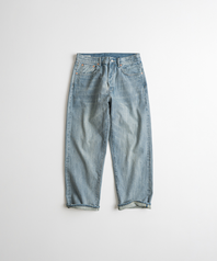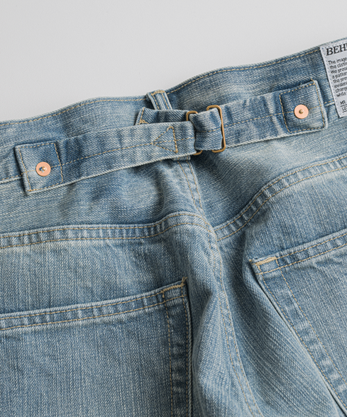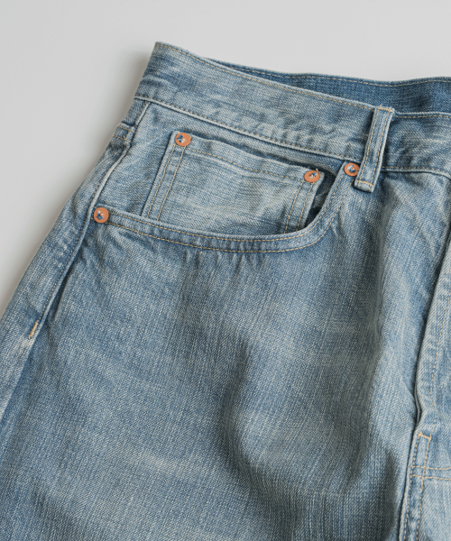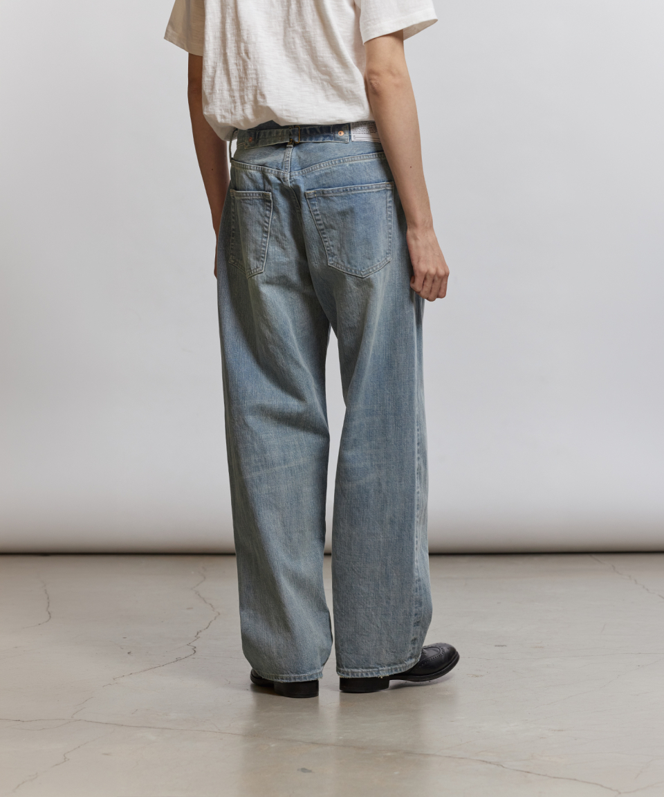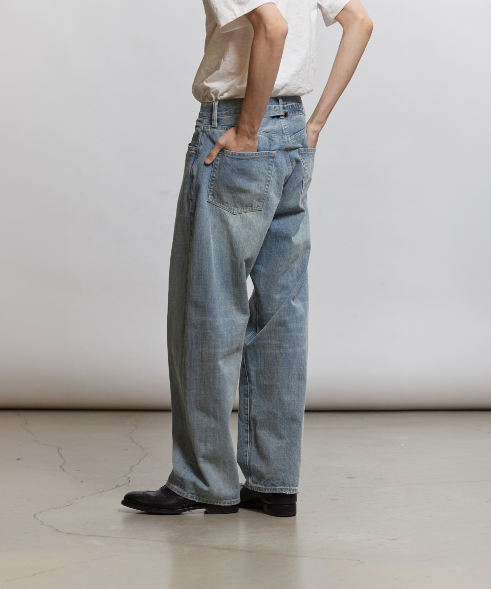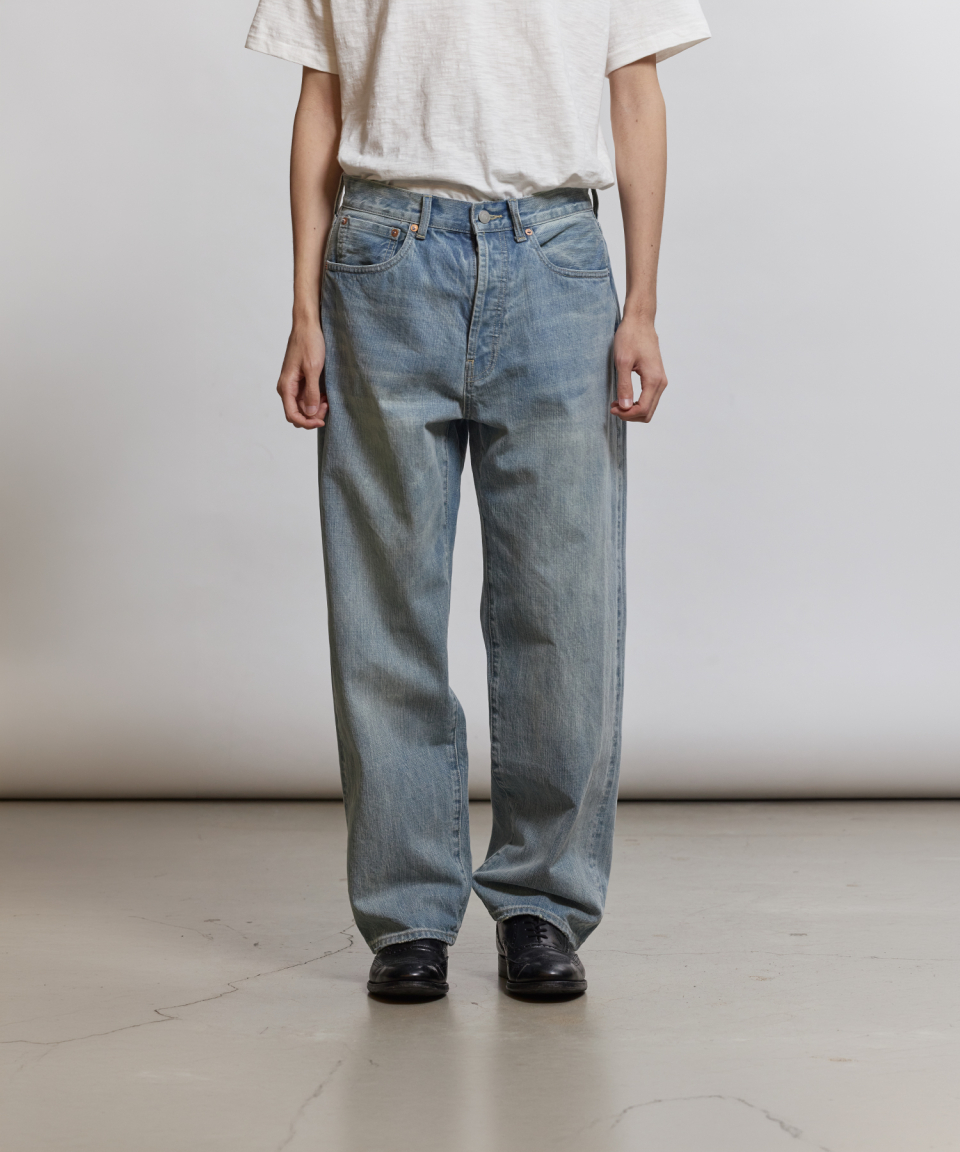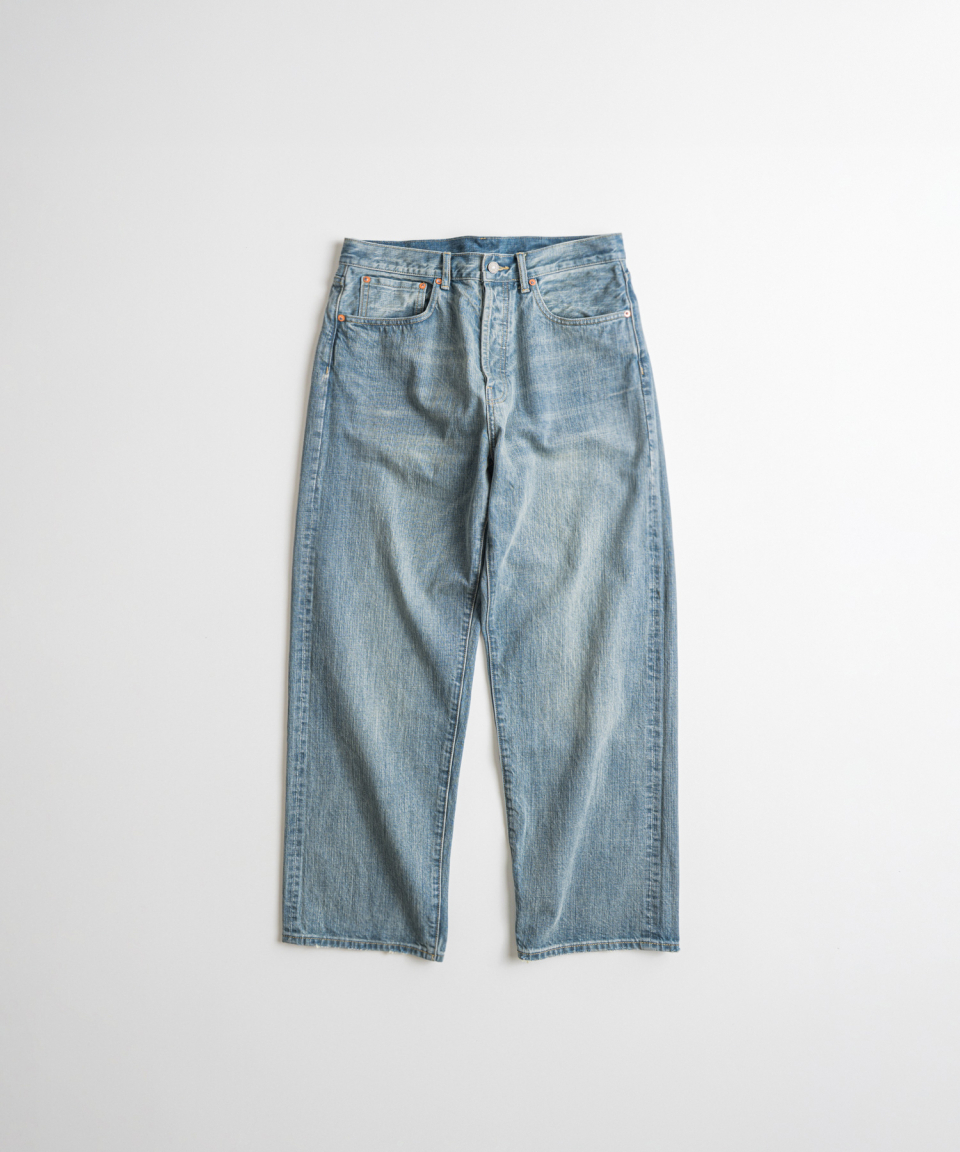 1930년대 와이드한 실루엣의 데님을 구현하기 위해, 미면사를 TOYODA社 셔틀 직기 방식 직조하여 구현된 14oz 셀비지 데님 팬츠입니다.