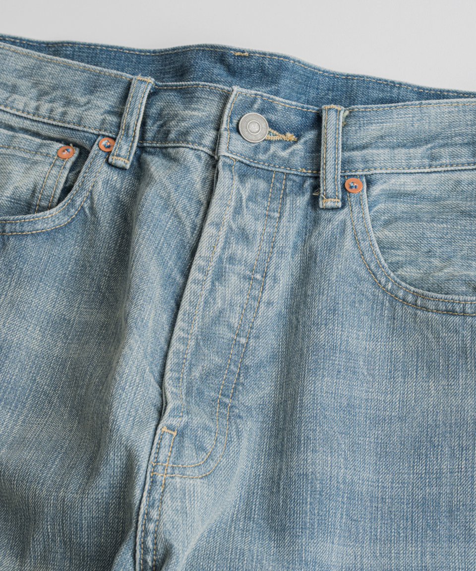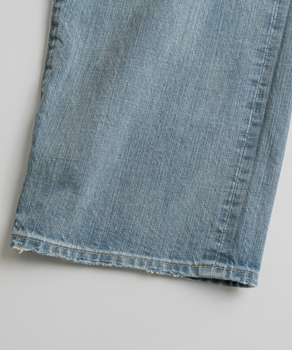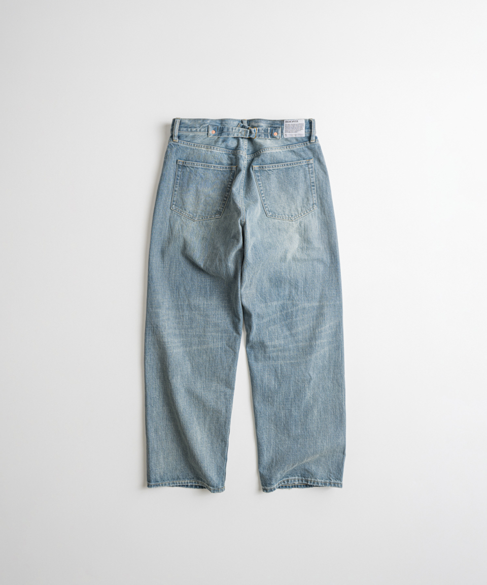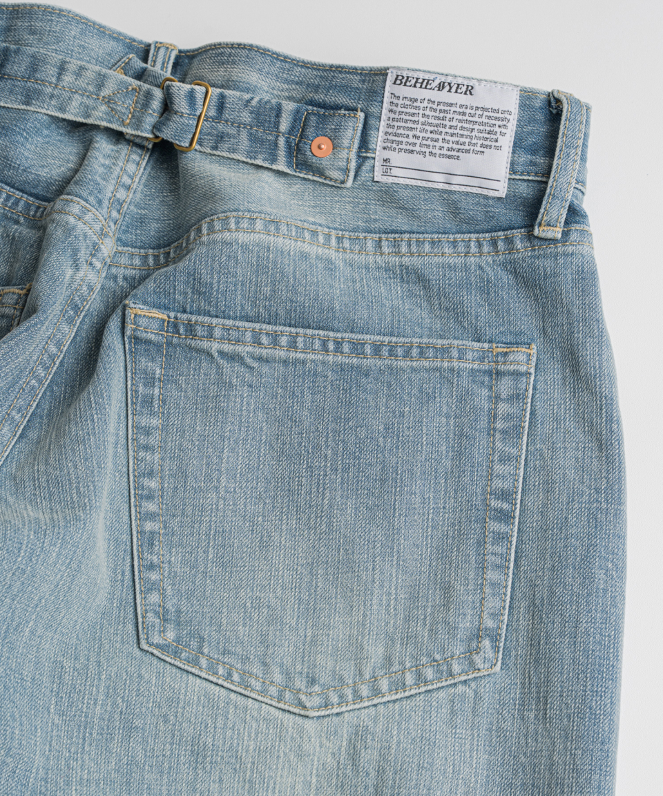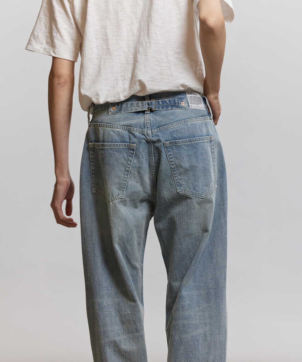 기본 5 POCKET 사양에 5개의 벨트 루프 형식으로 되어있으며, 밑단에는 인위적인 데미지를 더해 세월감을 표현했습니다.