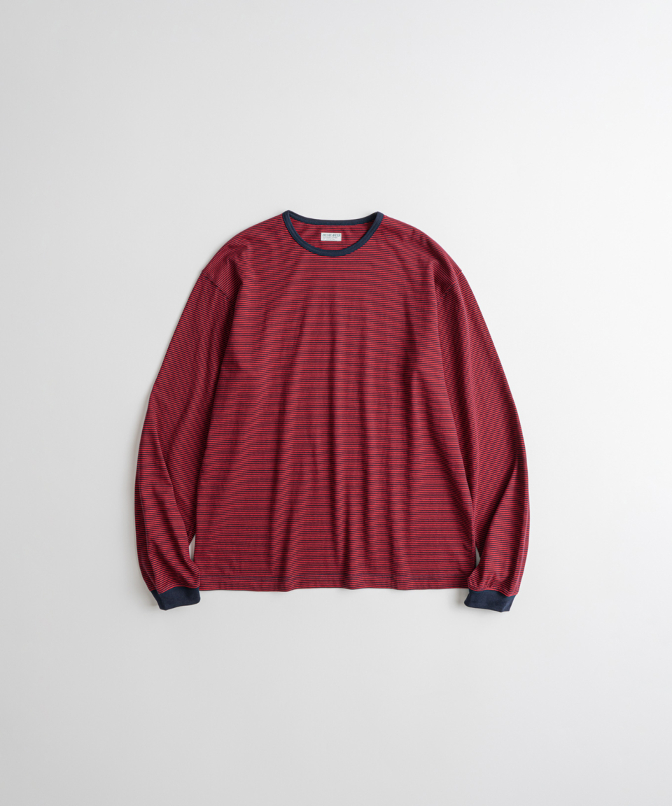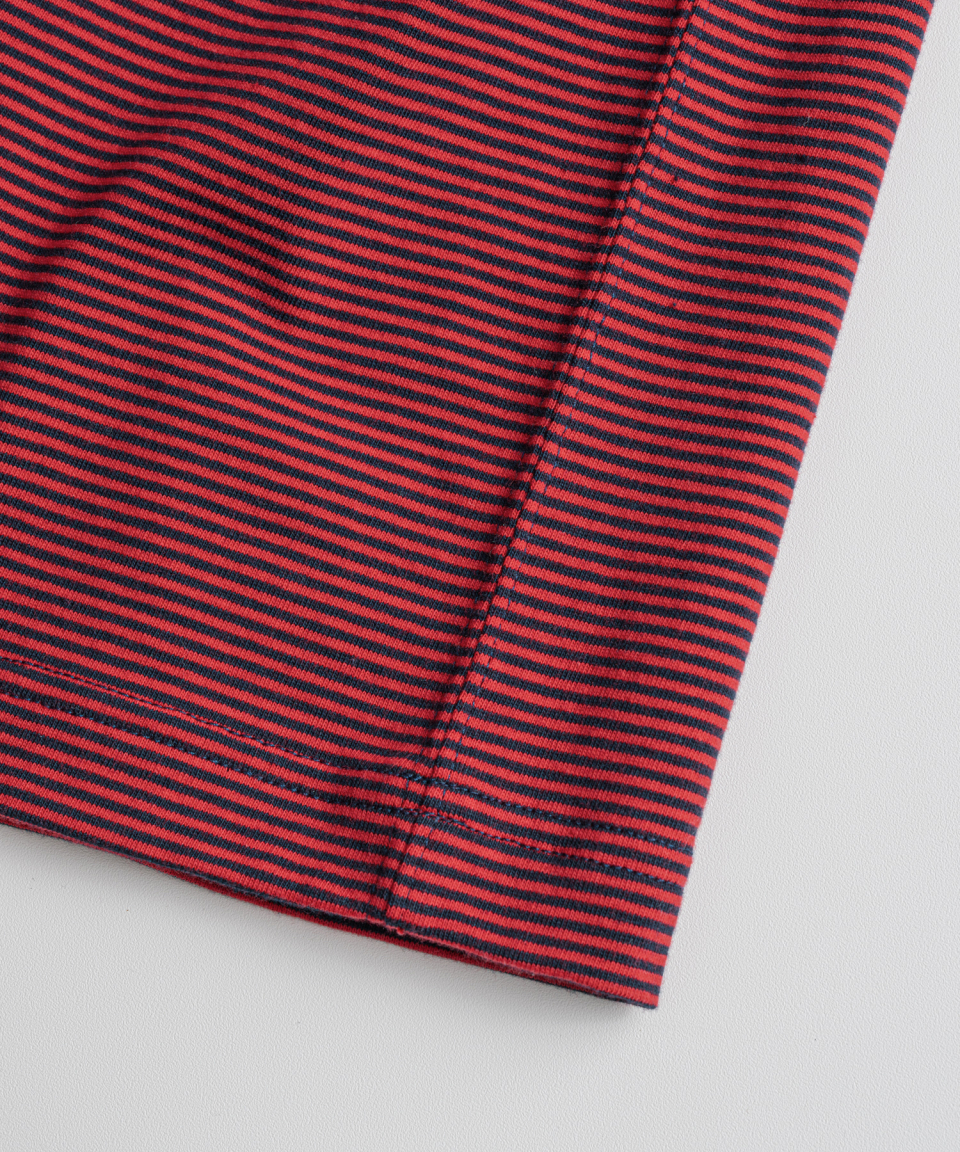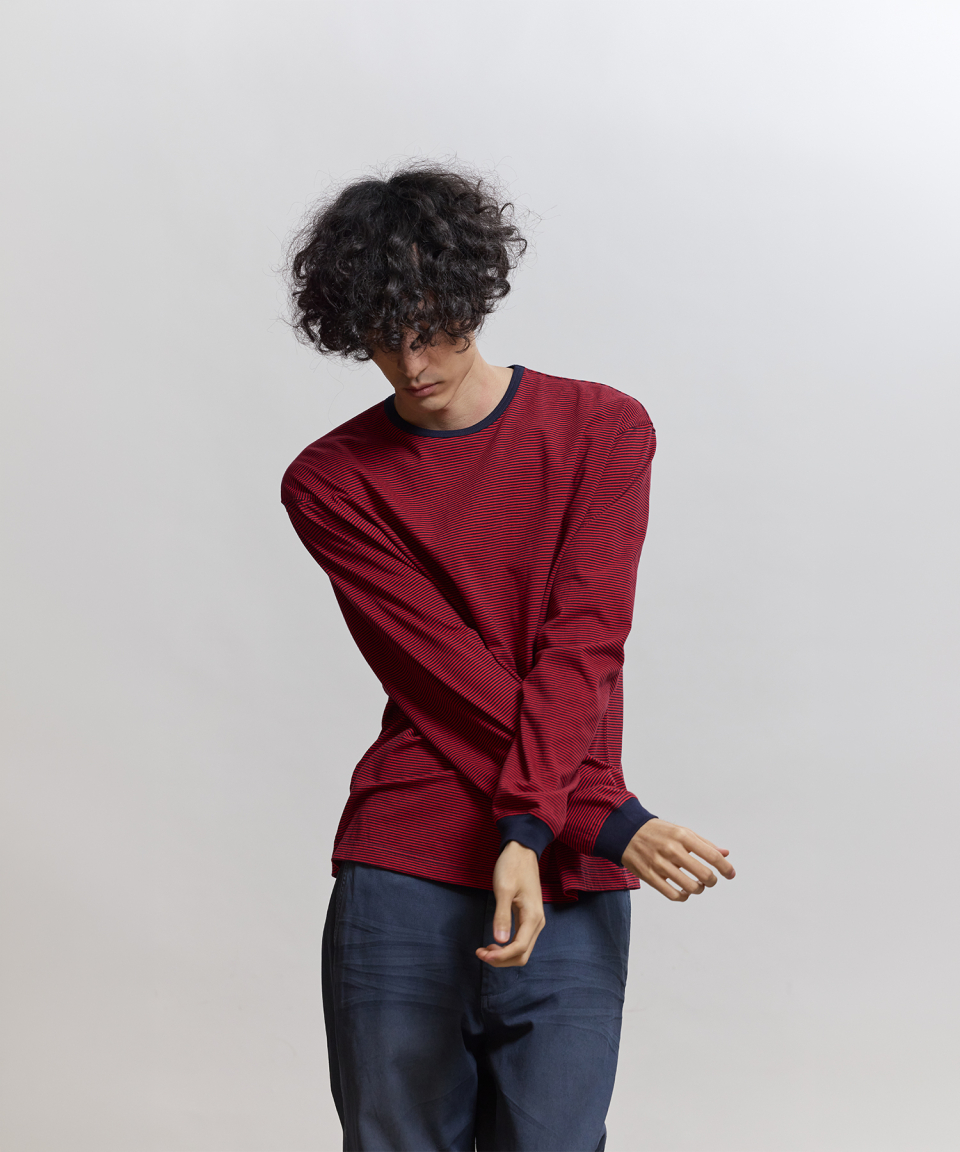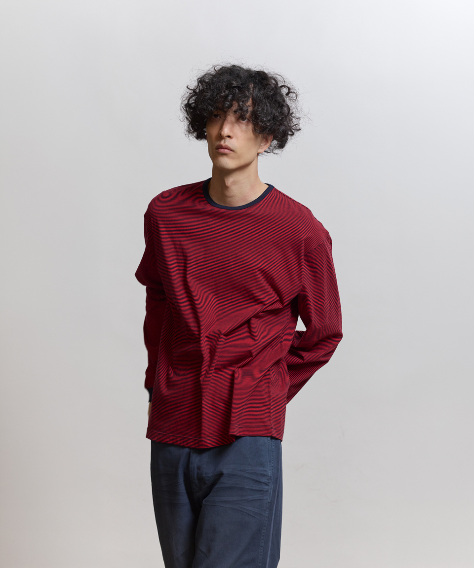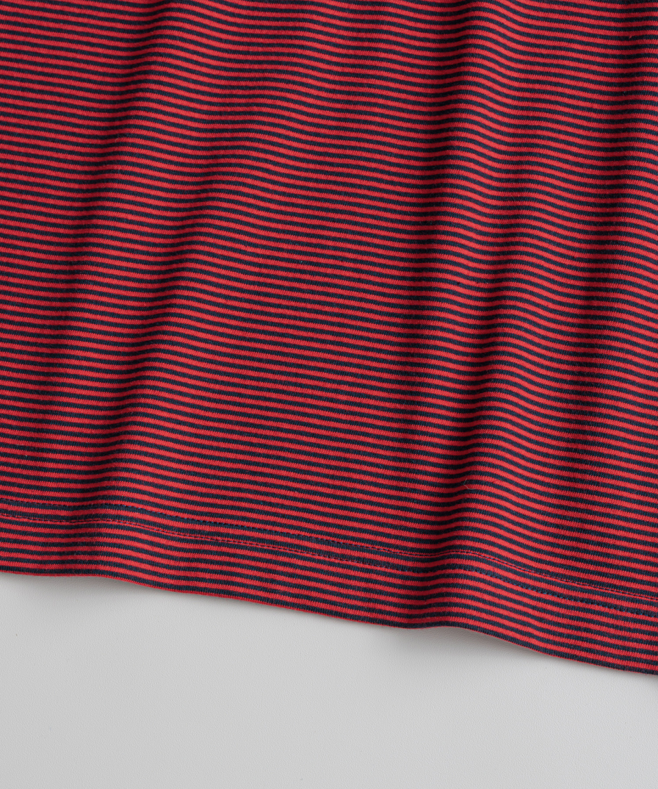 직접 직조한 좁은 간격의 스트라이프가 특징인 선염(先染) 싱글 저지 패브릭을 사용했습니다. 드라이하면서도 헤어리함이 느껴지는 터치감과 함께 편안한 착용감을 갖추었습니다. 여유 있게 설정된 네크라인 너비와 대비되는 좁은 리브를 적용해, 이너웨어는 물론 단품으로도 활용도가 높은 한 점입니다.