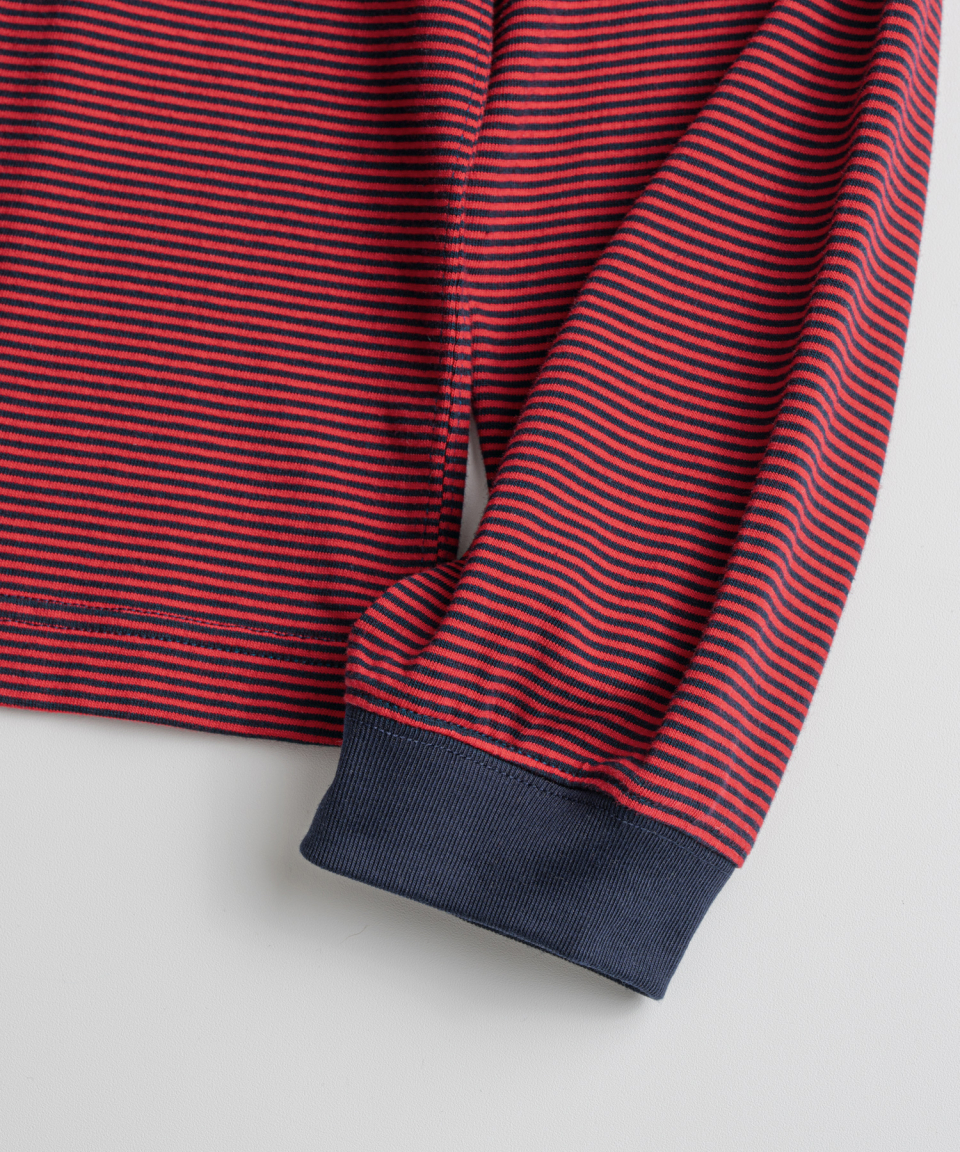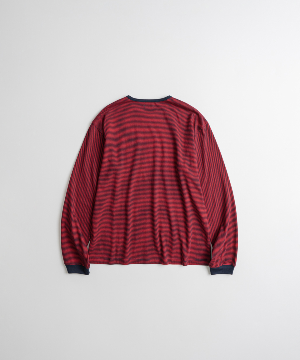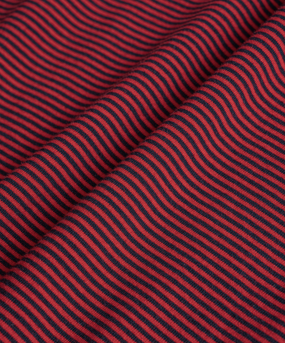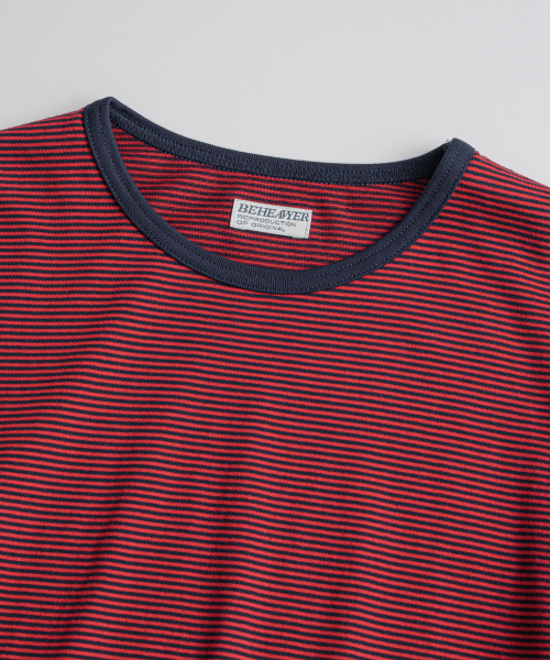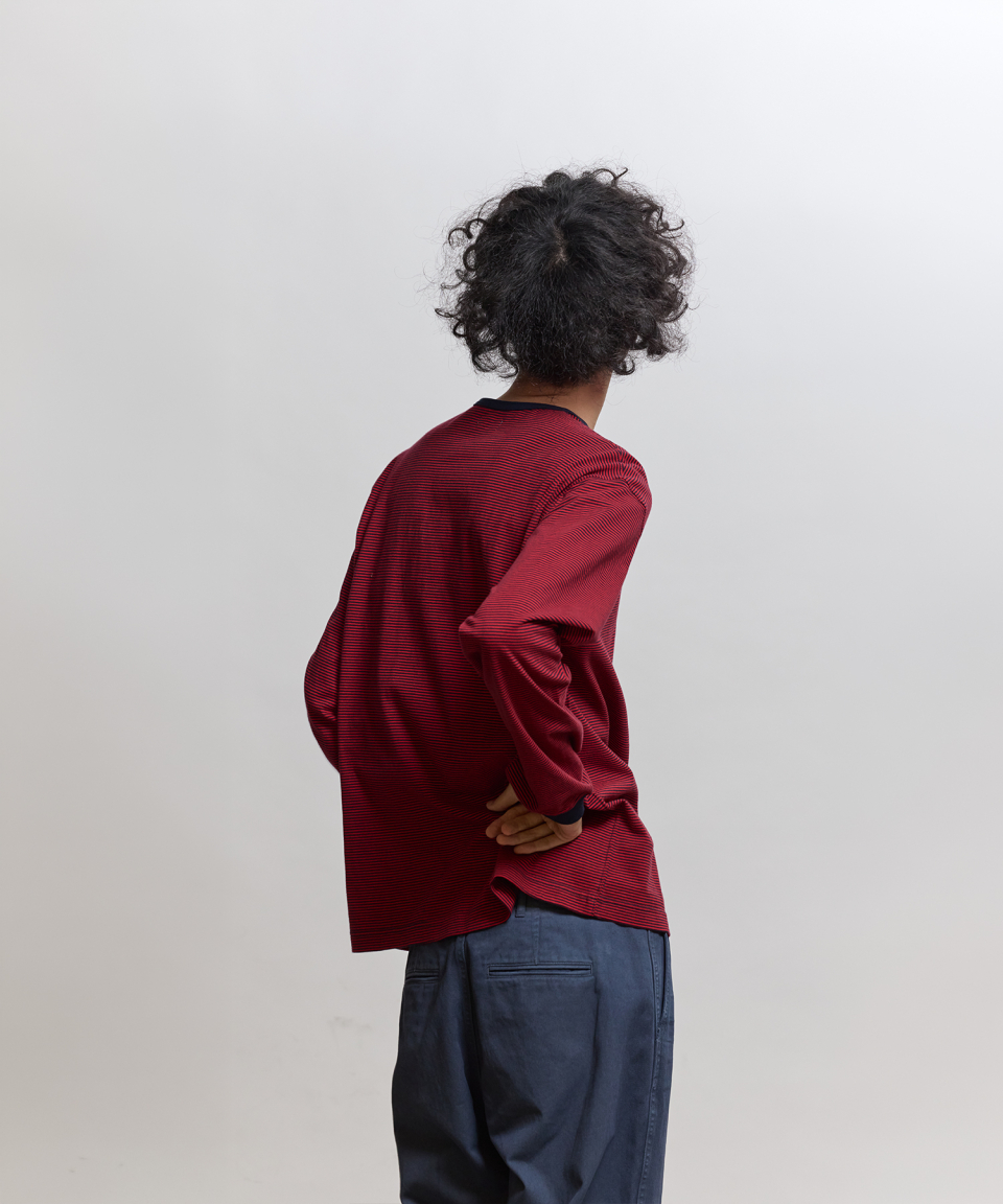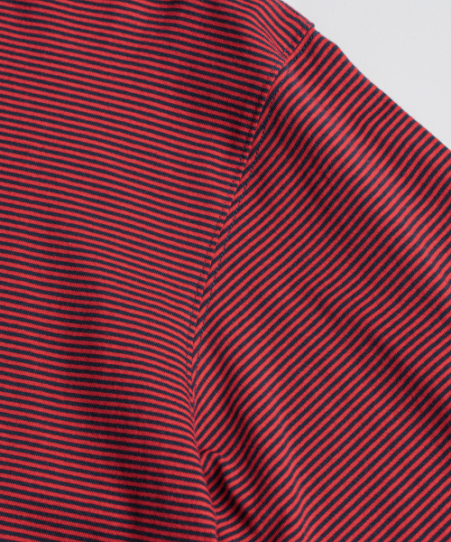 직접 직조한 좁은 간격의 스트라이프가 특징인 선염(先染) 싱글 저지 패브릭을 사용했습니다. 드라이하면서도 헤어리함이 느껴지는 터치감과 함께 편안한 착용감을 갖추었습니다. 여유 있게 설정된 네크라인 너비와 대비되는 좁은 리브를 적용해, 이너웨어는 물론 단품으로도 활용도가 높은 한 점입니다.