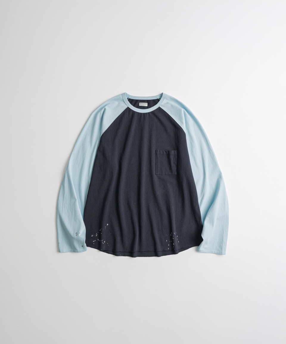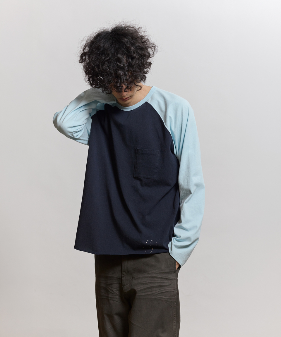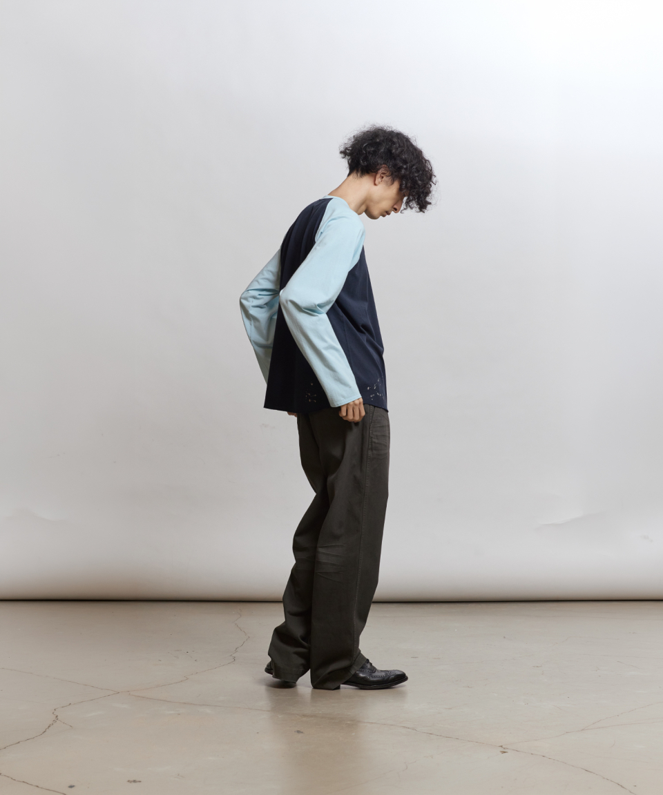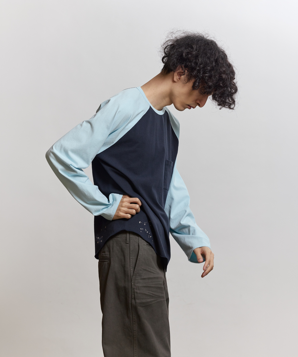 래글런 슬리브 구조와 러프한 마감으로 구현된 밑단의 곡선 패턴 등 당시의 디테일을 바탕으로, 보다 현대적인 컬러 배색을 더해 새롭게 해석했습니다. 여유 있게 설정된 네크라인 너비와 대비되는 좁은 리브를 적용해 이너웨어는 물론 단품으로도 활용도가 높은 실루엣을 완성했습니다.