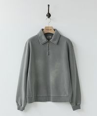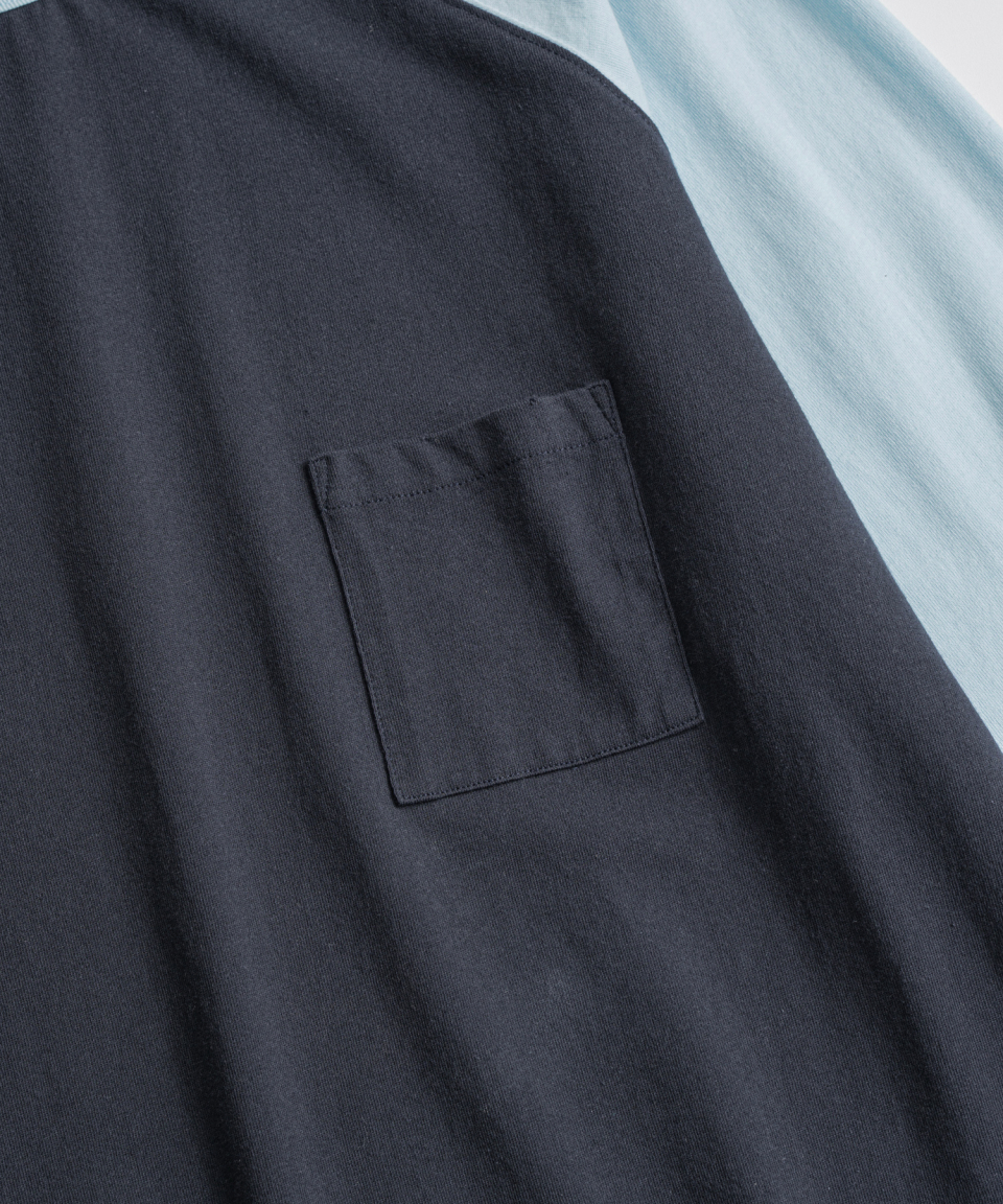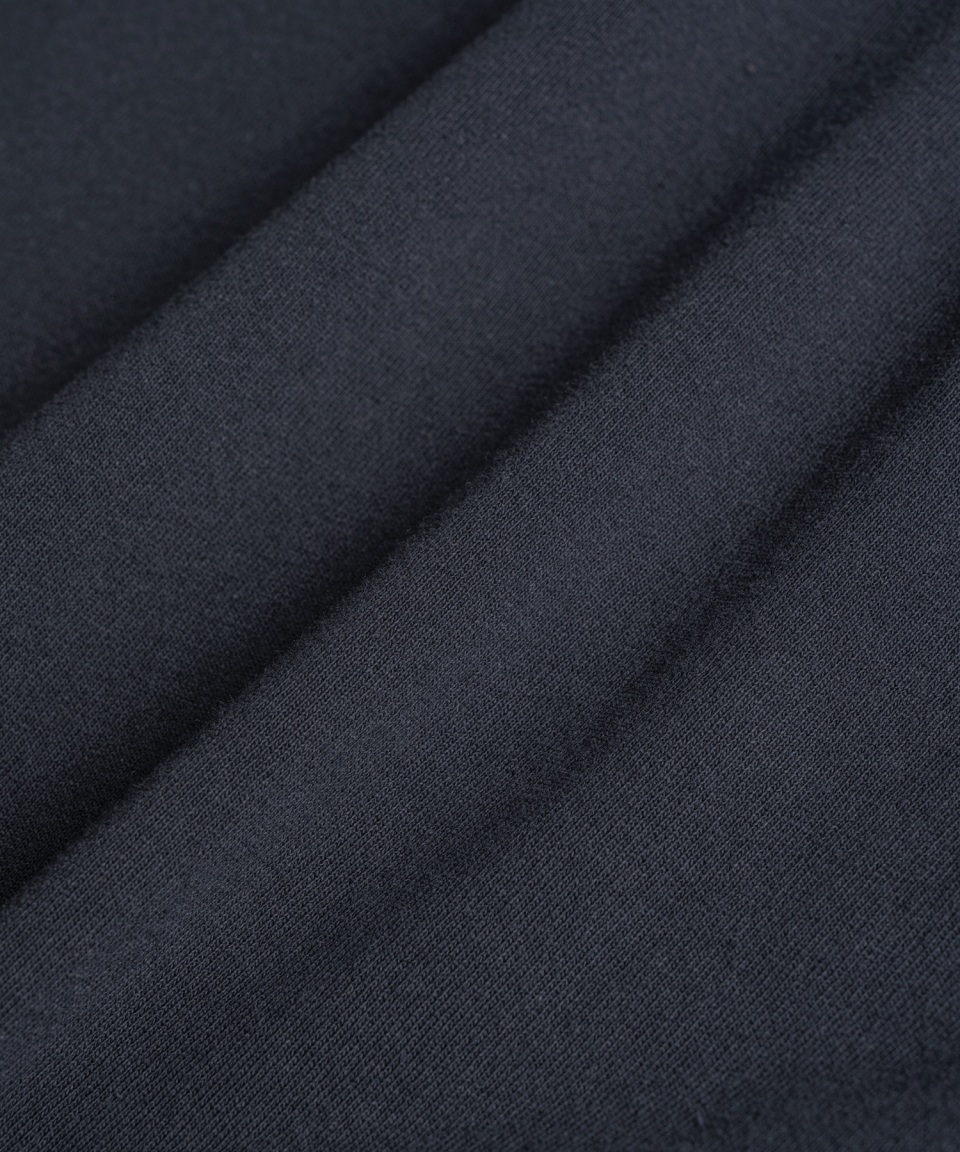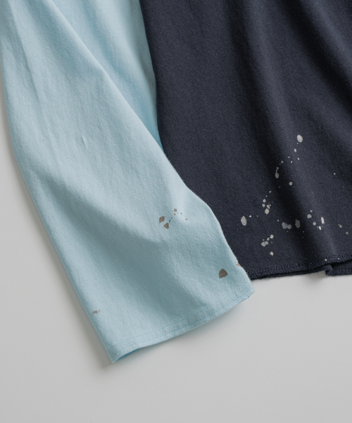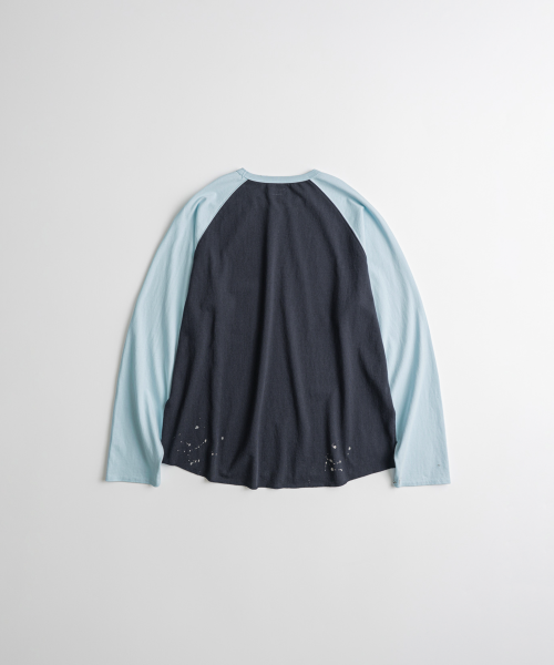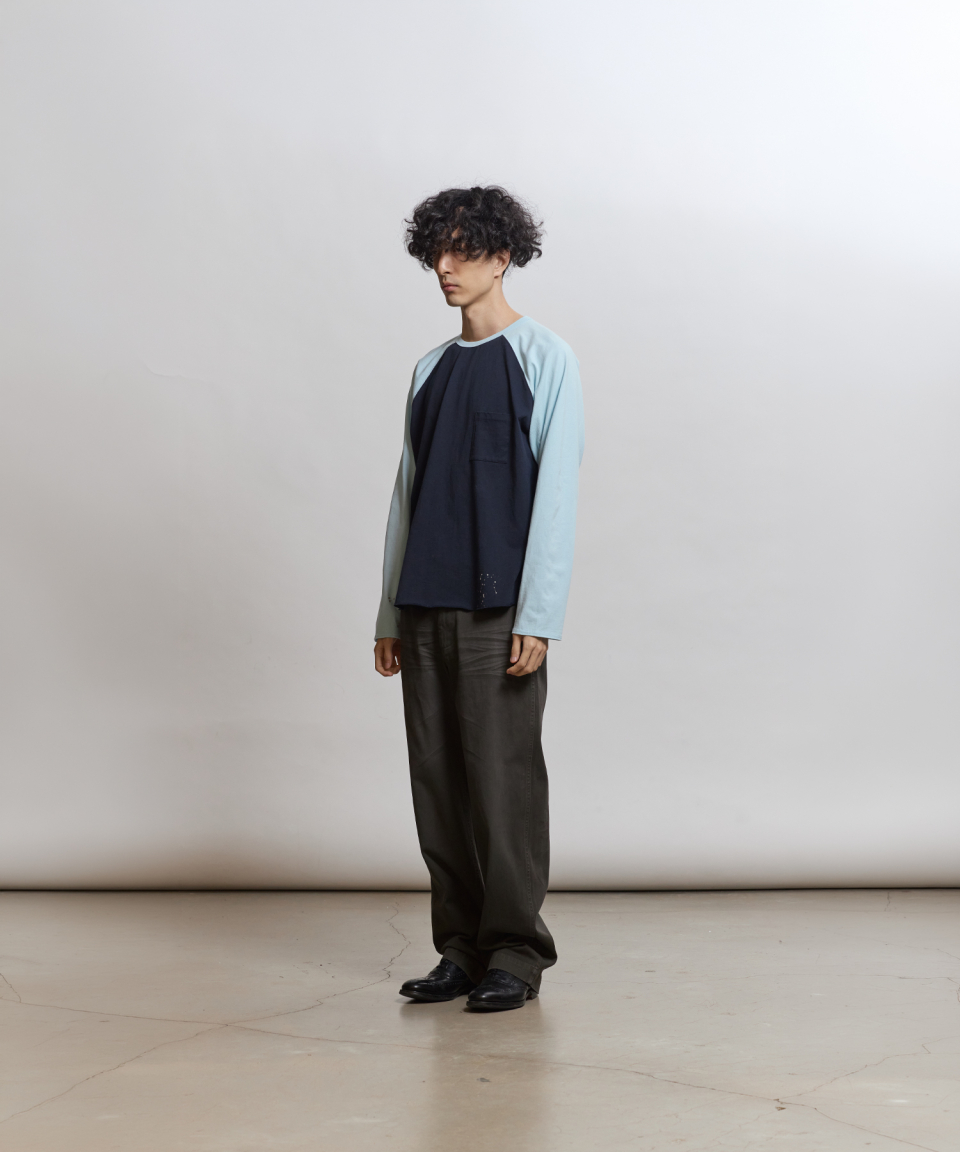 래글런 슬리브 구조와 러프한 마감으로 구현된 밑단의 곡선 패턴 등 당시의 디테일을 바탕으로, 보다 현대적인 컬러 배색을 더해 새롭게 해석했습니다. 여유 있게 설정된 네크라인 너비와 대비되는 좁은 리브를 적용해 이너웨어는 물론 단품으로도 활용도가 높은 실루엣을 완성했습니다.
