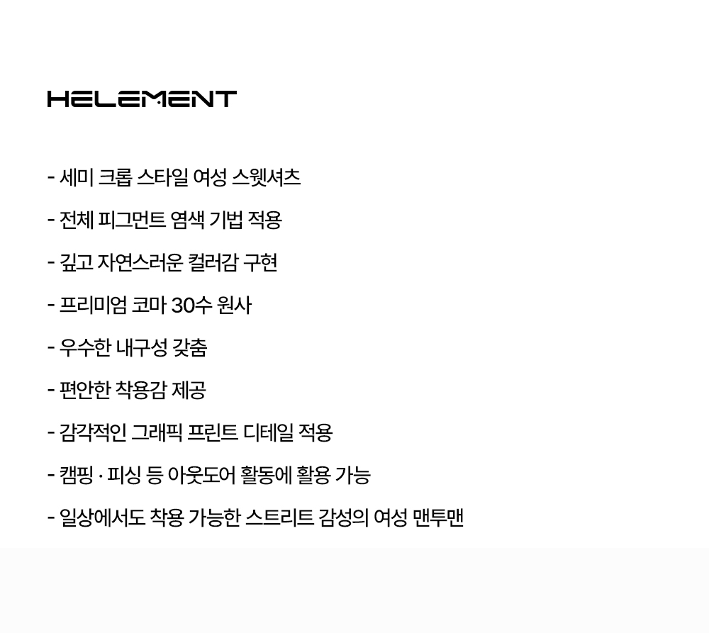 힐리먼트(HELEMENT)는 HEALING과 MOMENT의 합성어로 자연과 지속 가능성에 대한 의지를 뜻합니다. 환경을 사랑하고 후손에게 깨끗하고 아름다운 자연을 전해주기 위한 하나의 철학과 행동입니다. 자연 안에서, 자연과 함께 건강한 삶을 지향하고 힐링 하는 모든 순간 순간을 담아 지속가능한 삶을 위해 실천하고 향유하는 브랜드입니다.