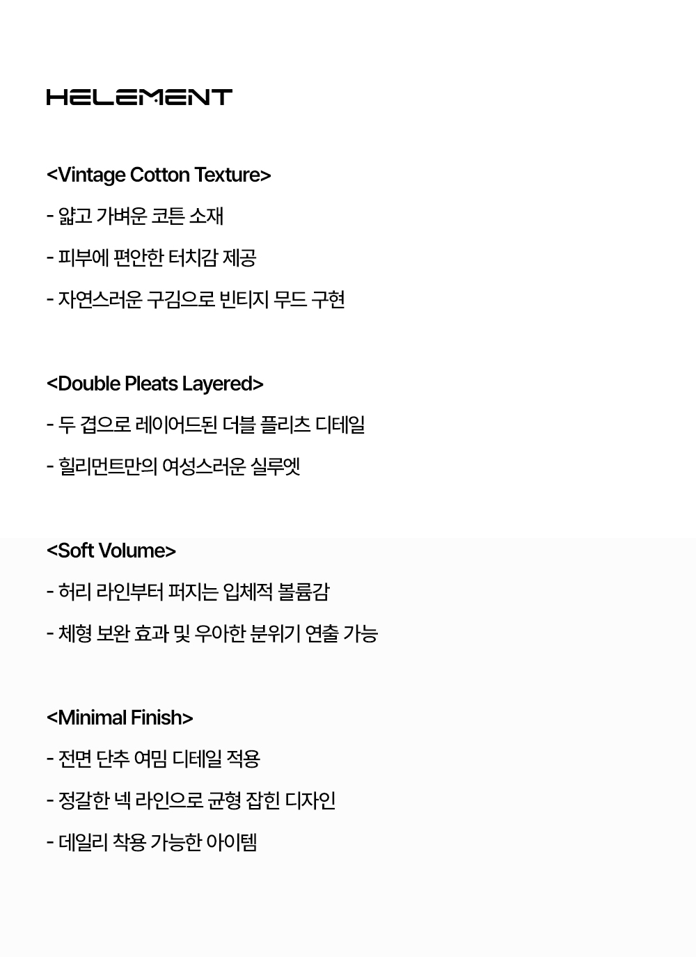 힐리먼트(HELEMENT)는 HEALING과 MOMENT의 합성어로 자연과 지속 가능성에 대한 의지를 뜻합니다. 환경을 사랑하고 후손에게 깨끗하고 아름다운 자연을 전해주기 위한 하나의 철학과 행동입니다. 자연 안에서, 자연과 함께 건강한 삶을 지향하고 힐링 하는 모든 순간 순간을 담아 지속가능한 삶을 위해 실천하고 향유하는 브랜드입니다.
