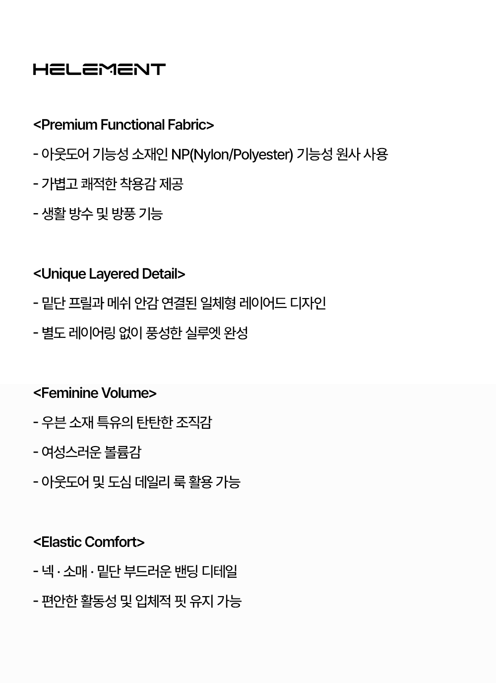 힐리먼트(HELEMENT)는 HEALING과 MOMENT의 합성어로 자연과 지속 가능성에 대한 의지를 뜻합니다. 환경을 사랑하고 후손에게 깨끗하고 아름다운 자연을 전해주기 위한 하나의 철학과 행동입니다. 자연 안에서, 자연과 함께 건강한 삶을 지향하고 힐링 하는 모든 순간 순간을 담아 지속가능한 삶을 위해 실천하고 향유하는 브랜드입니다.