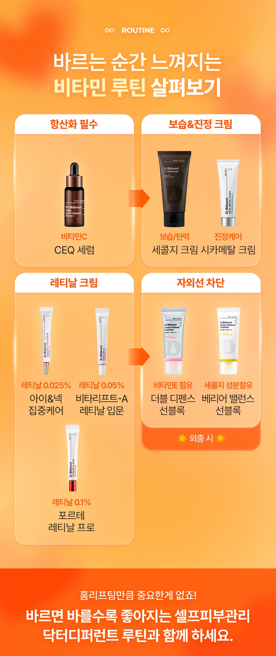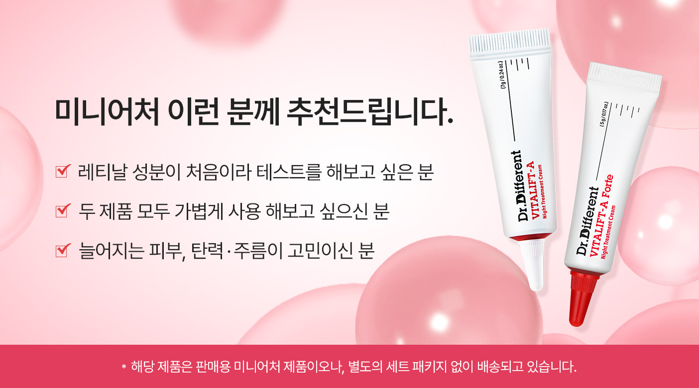 닥터디퍼런트(DR.DIFFERENT)는 건강한 피부를 위하여 효과적인 성분과 처방을 고민합니다. 트렌드를 좇지 않고 실질적인 피부 개선을 위해 필요한 성분만을 담았습니다.