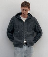 아란 케이블 니트 후디드 집업 [미디엄 그레이]