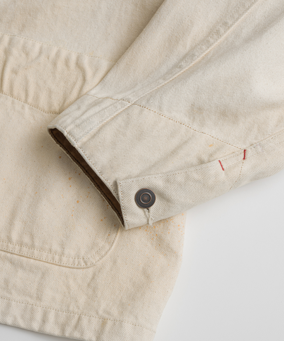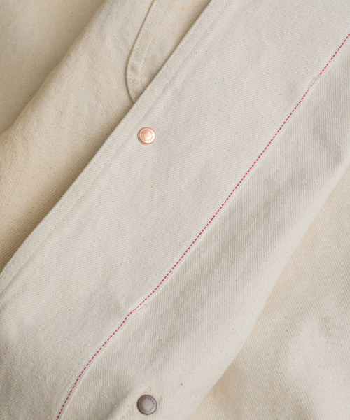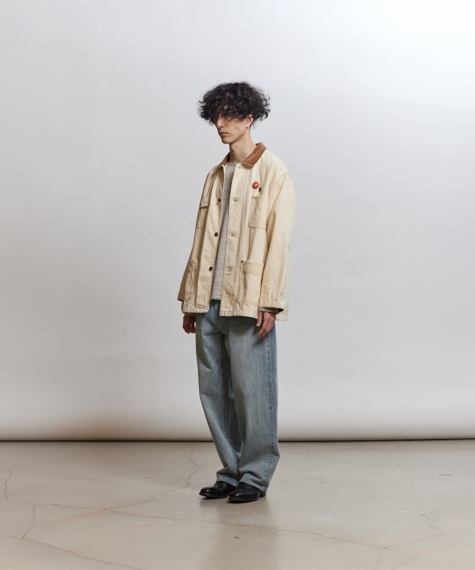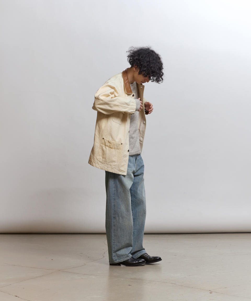 13.8oz 셀비지 데님 패브릭을 적용해 원류의 소재를 대체했으며, 가벼운 워싱 공정을 거쳐 자글거리는 표면이 인상적입니다.