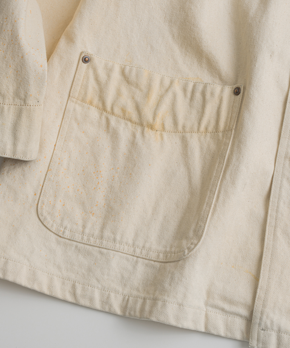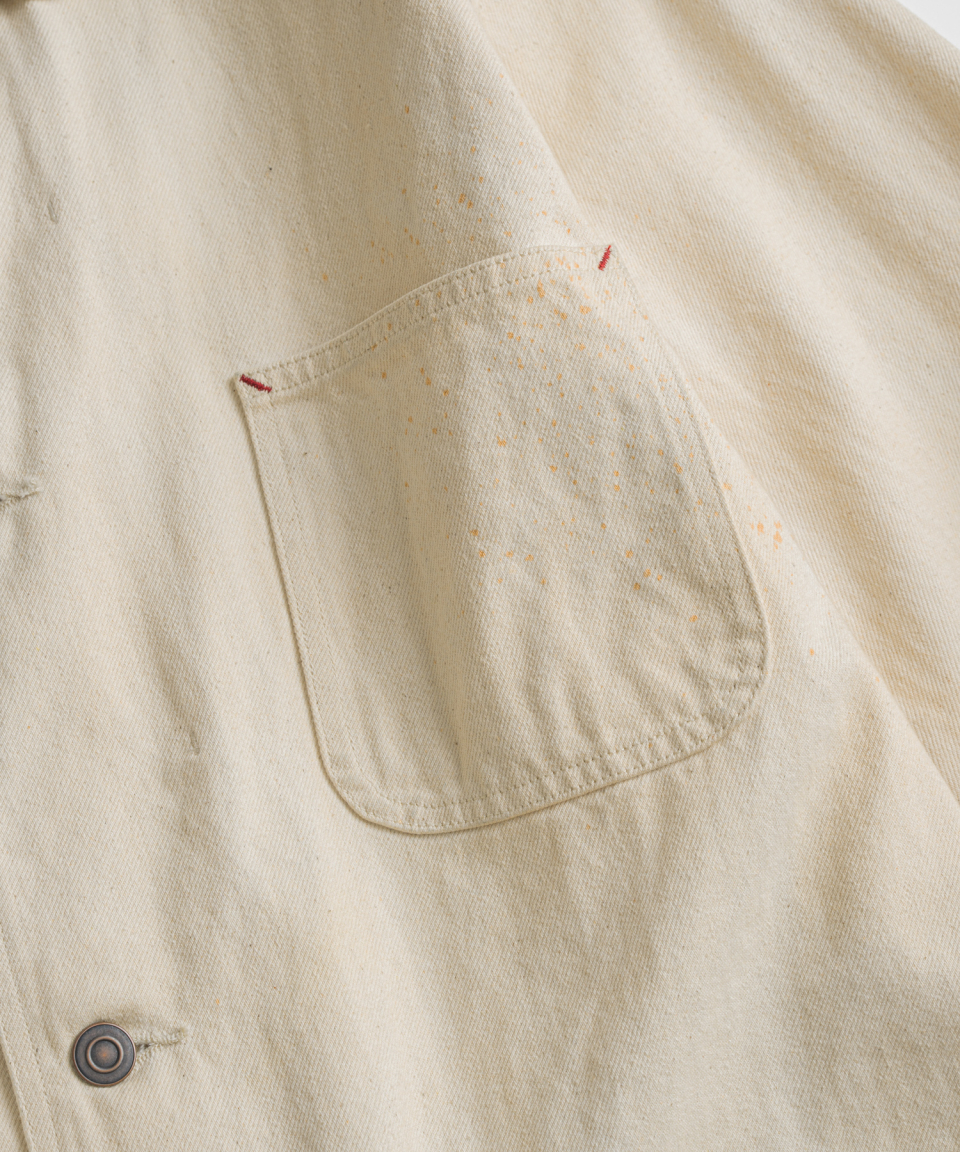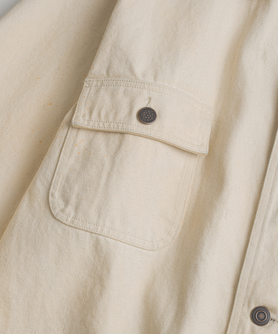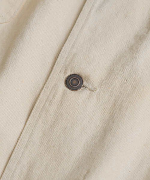 13.8oz 셀비지 데님 패브릭을 적용해 원류의 소재를 대체했으며, 가벼운 워싱 공정을 거쳐 자글거리는 표면이 인상적입니다.