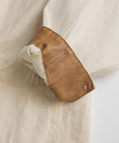 카라와 소매 안단 및 전면부 포켓 안단에는 두껍지 않은 양가죽을 덧대어 함께 워싱 처리해 독특한 질감을 더했습니다.