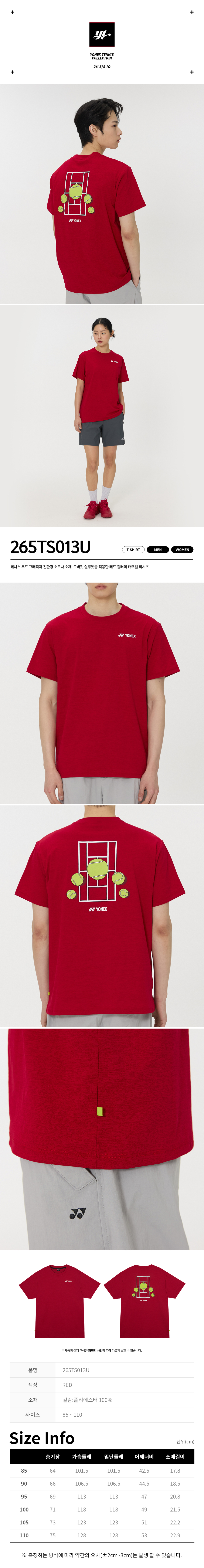 265TS013U 레드 남녀공용 테니스 볼 그래픽 캐주얼 반팔 티셔츠
