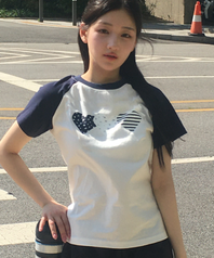 Heart Printed Cotton Ragian T-shirt White-Navy