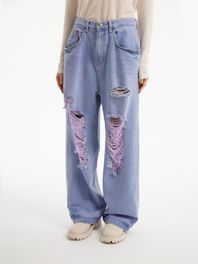 우먼즈 멀티 디스트로이드 와이드 데님 팬츠 [라이트 인디고]