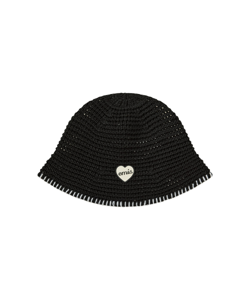패턴 텍스처가 돋보이는 하트 로고 와펜 패치가 매력적인 니트 버킷햇입니다.