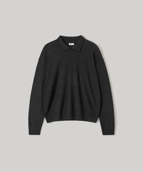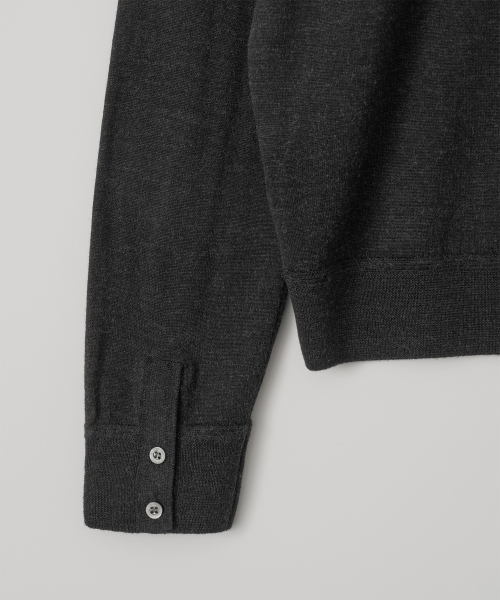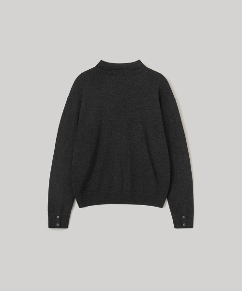 카라 니트와 크루넥을 겹쳐 입은 듯한 유니크한 넥 라인과 셔츠의 요소를 담은 소매 커프스 디테일은