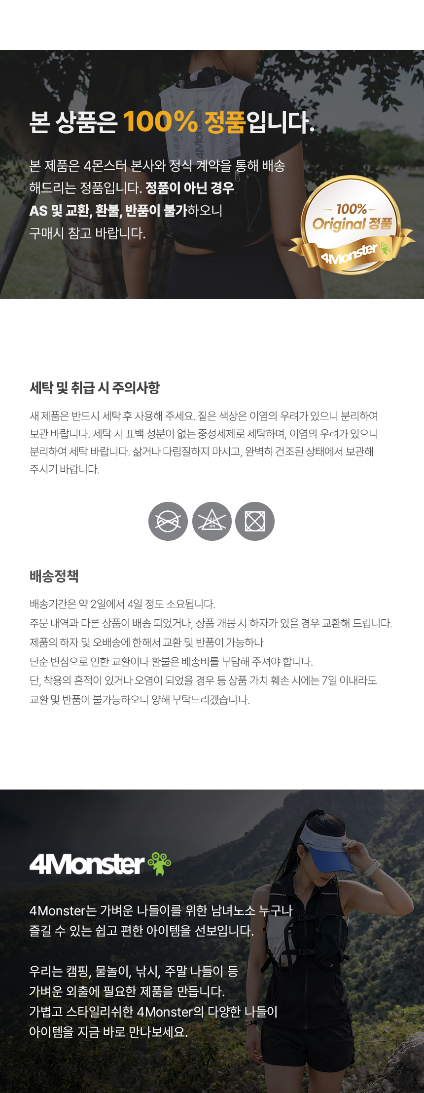 4몬스터(4MONSTER)는 ‘Ultra Light, Portable, Ready to Go’를 모토로, 당신의 가벼운 일상을 위해 남녀노소 누구나 즐길 수 있는 레저&아웃도어 라이프스타일 아이템을 선보입니다.