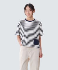 코튼 여성 스트라이프 세미크롭 반팔 티셔츠 (S25MWFTS69) Navy