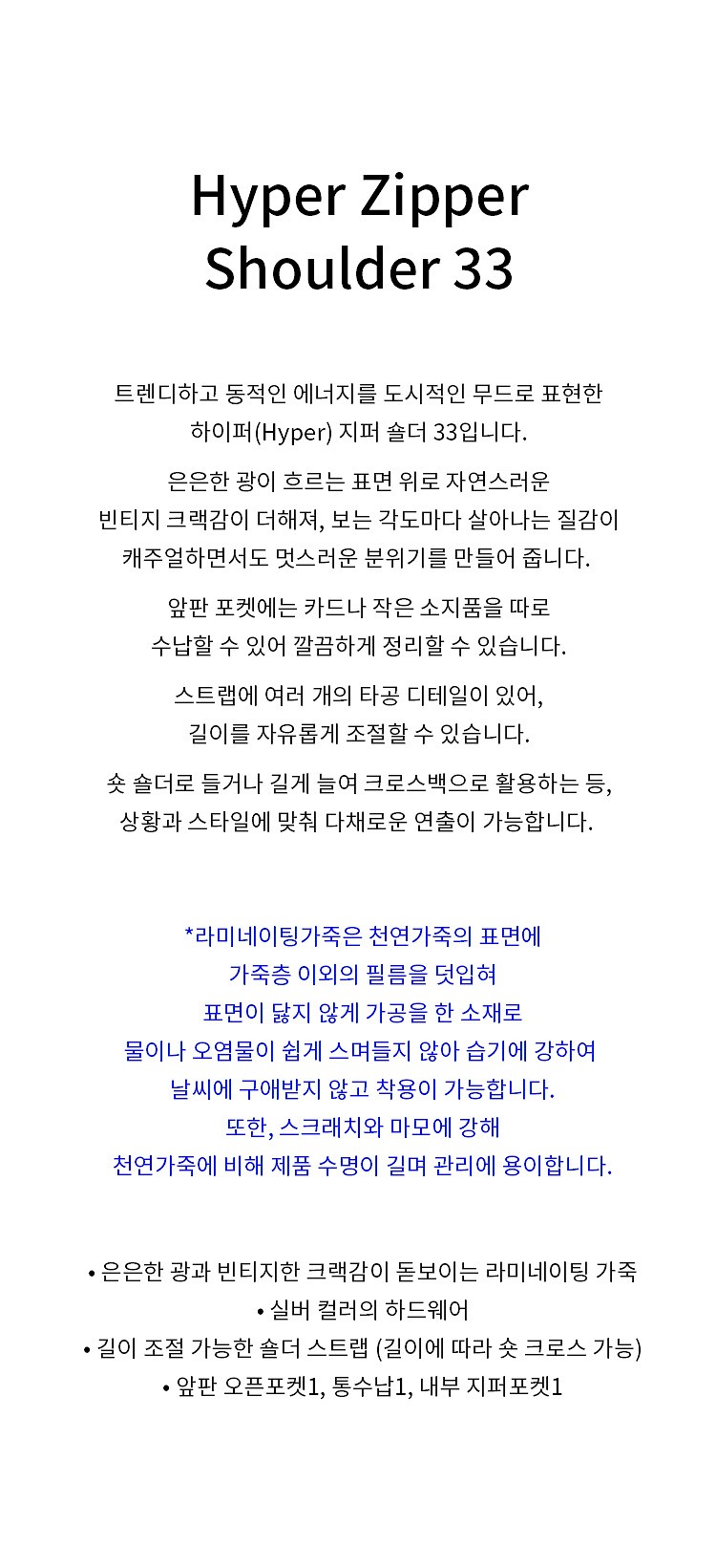 * 소재:라미네이팅가죽 / 폴리에스터 80% 면 20%(안감)