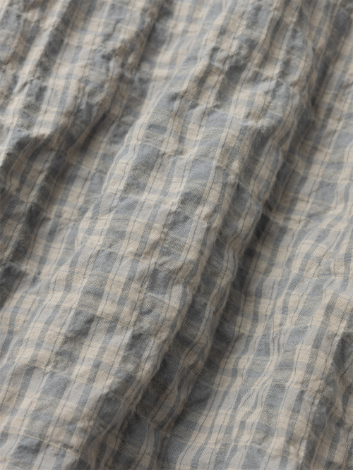 일본산 셔링 체크 원단을 사용하였습니다. 코튼 99%에 1%의 폴리우레탄 실을 섞어 원단에 자연스러운 주름과 텐션이 생기도록 한 원단입니다. 얇으면서도 탄력이 있는 원단으로 여름철 구김 걱정없이 캐주얼한 룩을 연출하기에 좋습니다. 아틀리에 델디오는 특유의 촉감과 색감을 위해 프리미엄 수입원단만을 고집합니다.
