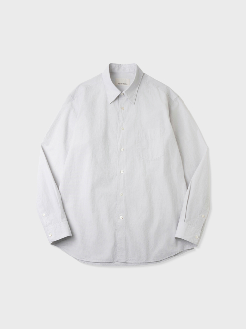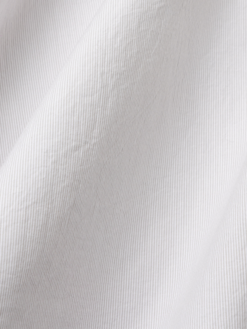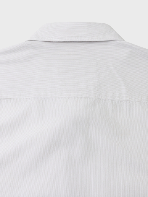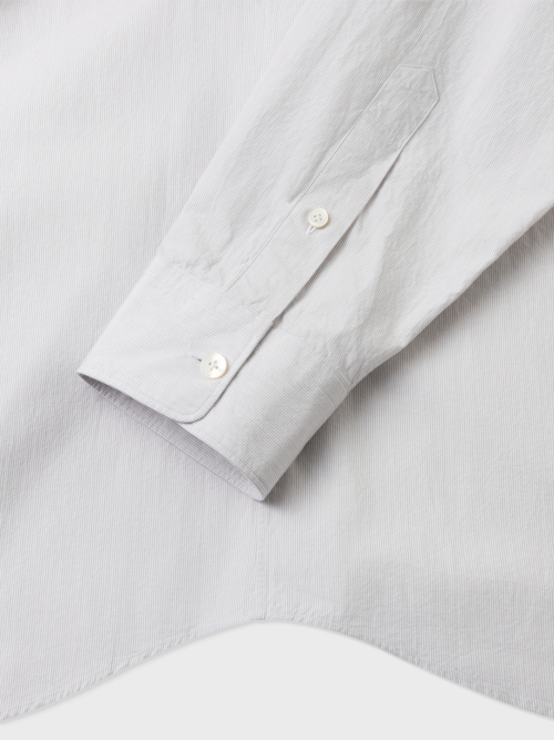헤어라인 스트라이프 패턴의 오가닉 코튼 원단으로 만든 테이퍼드 셔츠입니다. 멀리서 보면 단색으로 보이는 미세한 간격의 스트라이프 원단입니다. 여유로운 실루엣을 살리면서도 허리라인을 조정하여 자연스럽게 넣어입을 수 있도록 만들었습니다. 미니멀하고 프로패셔널한 룩을 위하여 앞판 플라켓과 뒷판 주름을 생략하고 가슴 포켓을 추가하여 실용성을 높였습니다. 캐주얼함과 포멀함을 모두 만족시키는 셔츠입니다. 타이와 매치하기에도 좋은 디자인의 셔츠로 캐주얼 룩부터 셋업 수트까지 다양한 코디가 가능합니다.