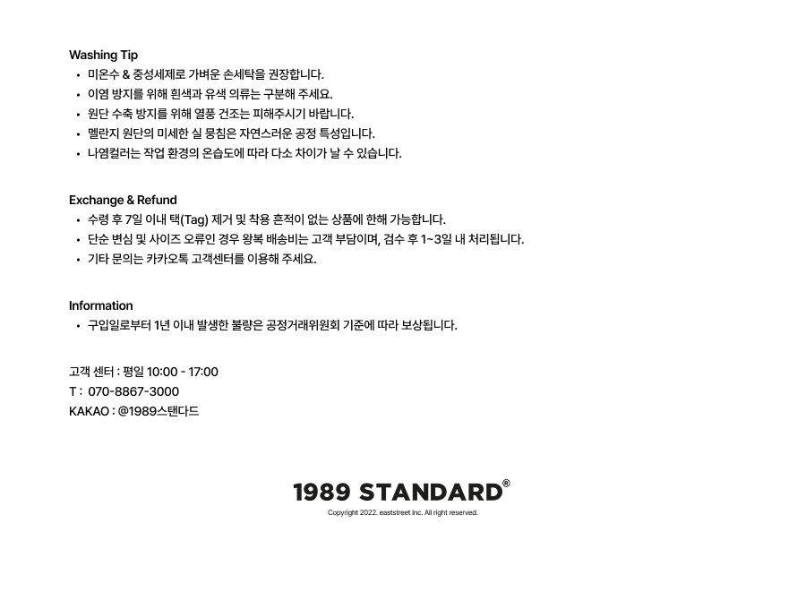 1989스탠다드(1989STANDARD)는 'A new generation of archive(새로운 세대의 아카이브)'라는 슬로건 아래 과거의 스트릿패션을 트렌디하게 재해석해 일상에서 더욱 자유롭고 편안하게 입을 수 있는 스타일을 제시하는 유니섹스 브랜드입니다.