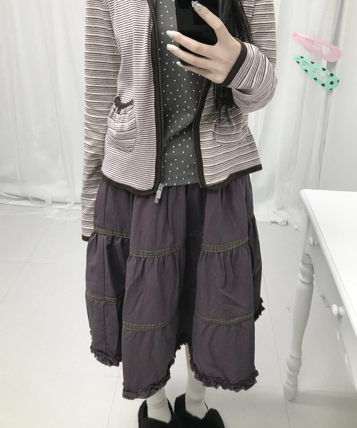 체크 배색 프릴 포인트 볼륨 플레어 캉캉 미디 스커트 [퍼플]
