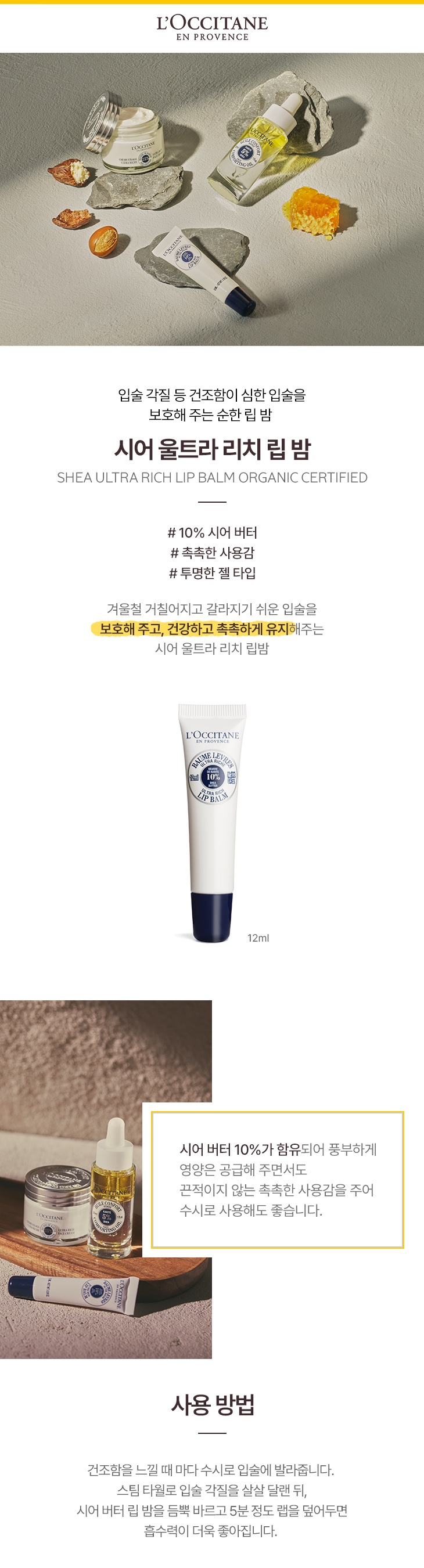| 사용방법 | 건조함을 느낄 때 마다 수시로 입술에 발라줍니다. 스팀 타월로 입술 각질을 살살 달랜 뒤, 시어버터 립 밤을 듬뿍 바르고 5분 정도 랩을 덮어두면 흡수력이 더욱 좋아집니다. |