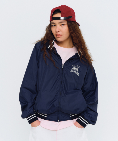 Hello Sunrise 남여 공용사이즈의 나일론자켓입니다. - 전면 헬로선라이즈 아치 로고 그래픽 자수 - 2way 지퍼 사용 - 후면 헬로선라이즈 태양심볼 그래픽 자수 포인트 * 측정 기준에 따라 1-2cm의 차이가 있을 수 있습니다. * Shell : Nylon 100%, Lining : Polyester 100% * Made in Korea * Womens Model : 172cm / Size : Medium