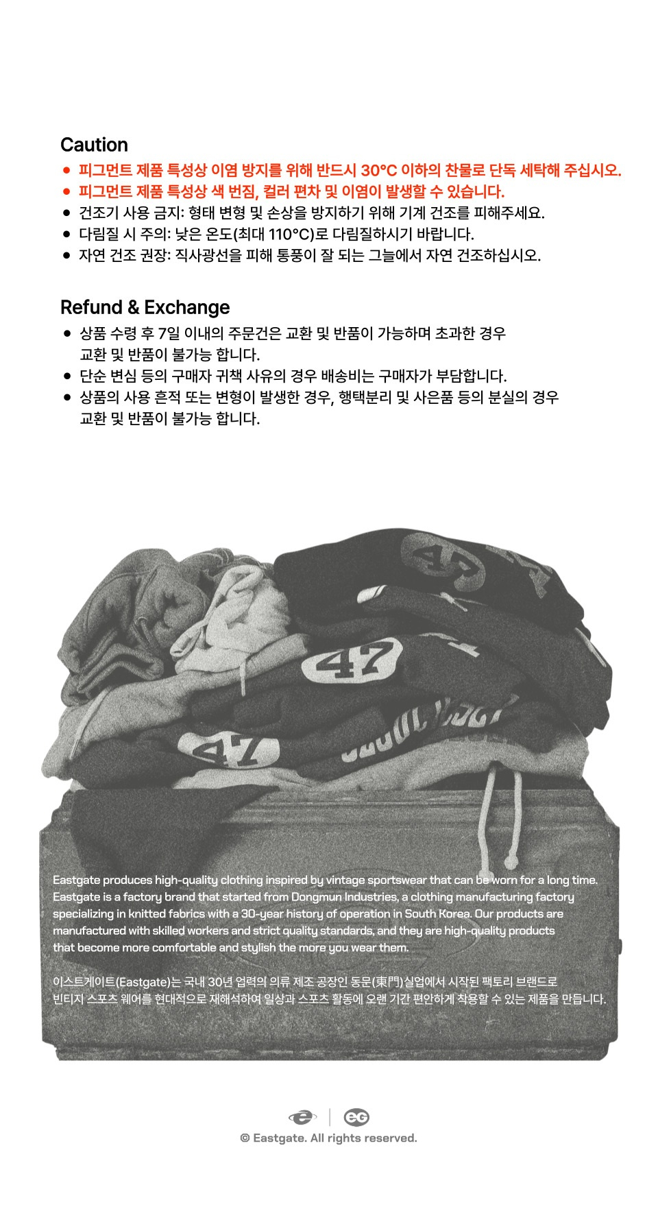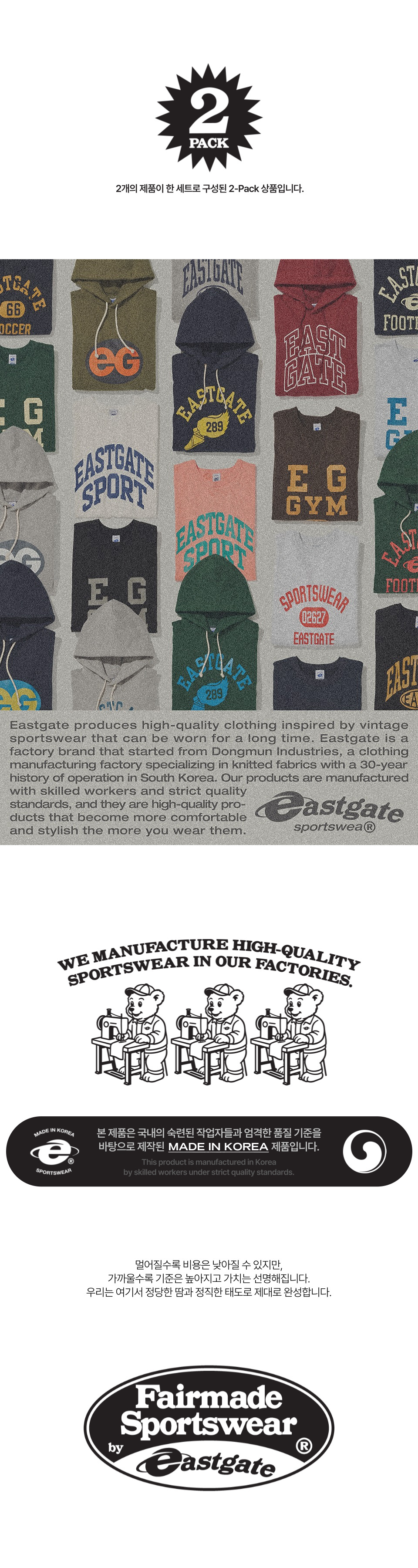 이스트게이트(EASTGATE)는 빈티지 스포츠 웨어를 현대적으로 재해석하여 오랜 기간 착용 가능한 높은 품질의 제품을 생산하며 일상과 스포츠 활동에 편안하게 착용할 수 있는 스포츠 웨어를 만드는 브랜드입니다.