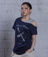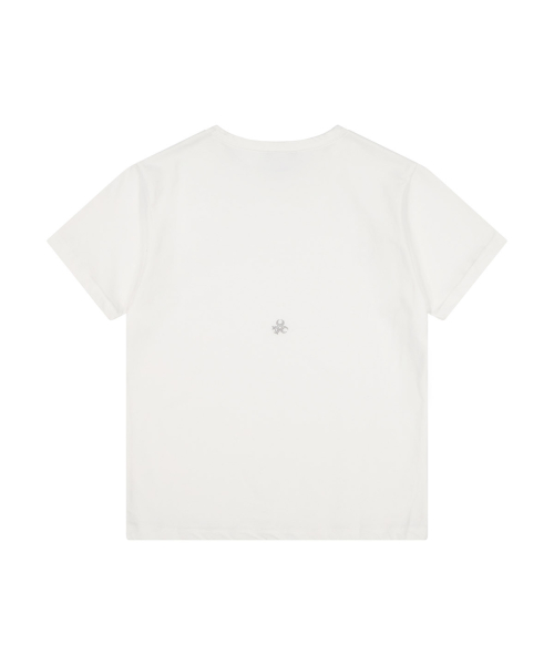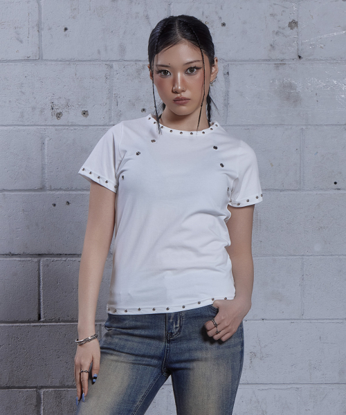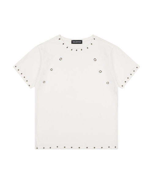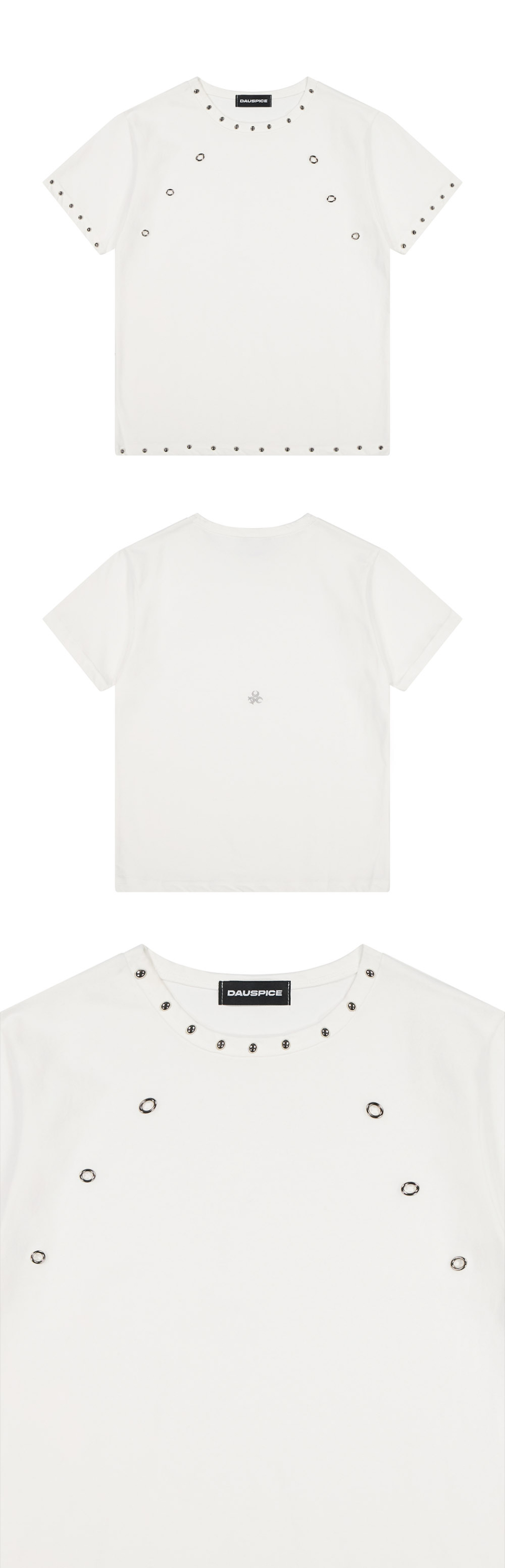전체적으로 배치된 아일렛과 스터드 디테일이 디자인에 포인트를 더하고, 바디 라인을 따라 슬림하게 밀착되는 실루엣에 부드러운 터치감의 원단을 더해 곡선을 자연스럽게 강조한 숏슬리브 티셔츠입니다.