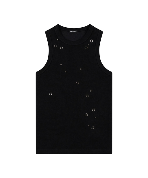 A slim-fit tank top made with elastic stretch and soft-textured fabric, finished with randomly placed eyelet and stud details as a design point.