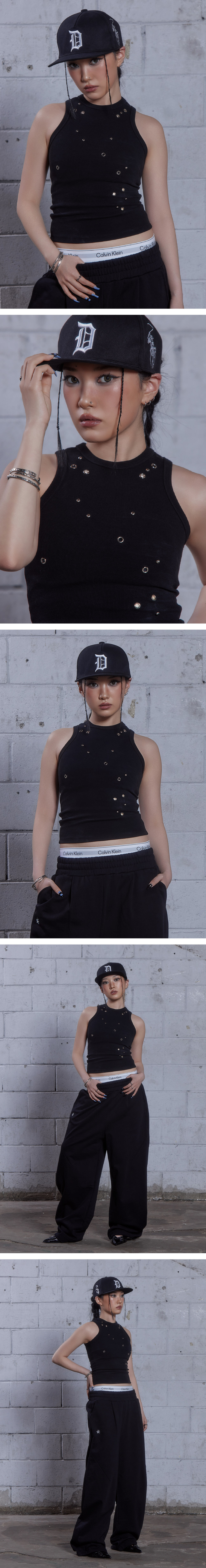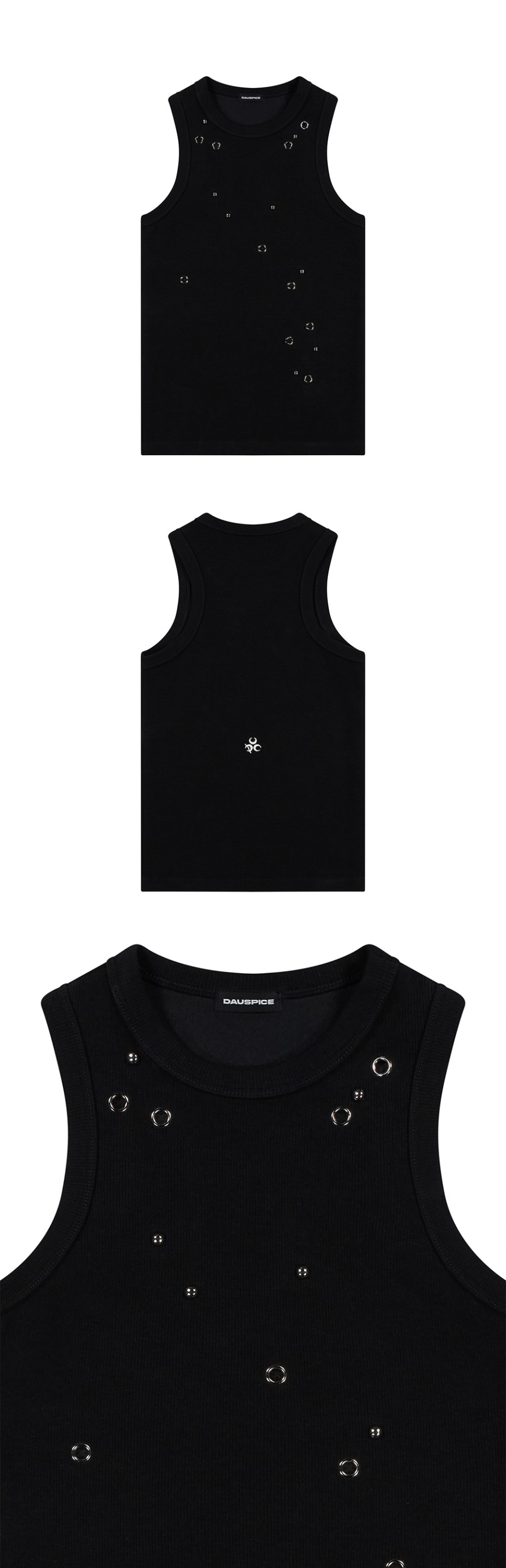 슬림하게 밀착되는 실루엣의 탱크탑으로, 탄력 있는 스트레치와 소프트한 텍스처의 원단을 사용했으며 랜덤하게 배치된 아일렛과 스터드 디테일로 포인트를 더한 디자인입니다.