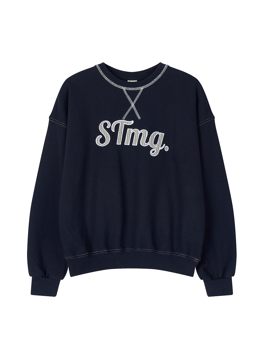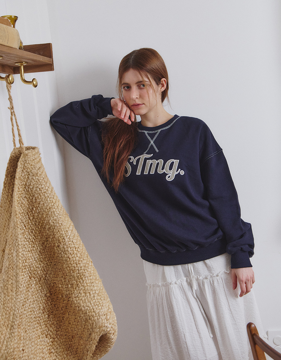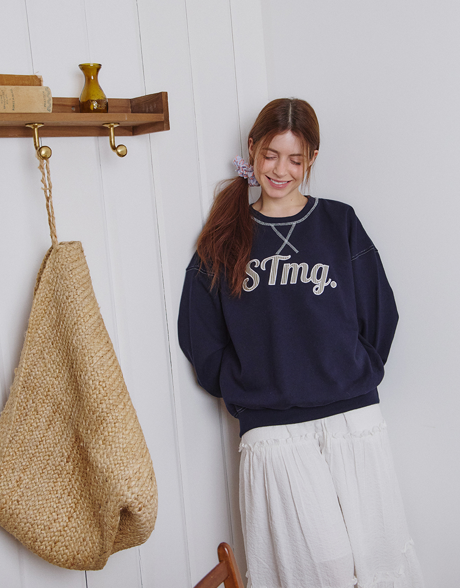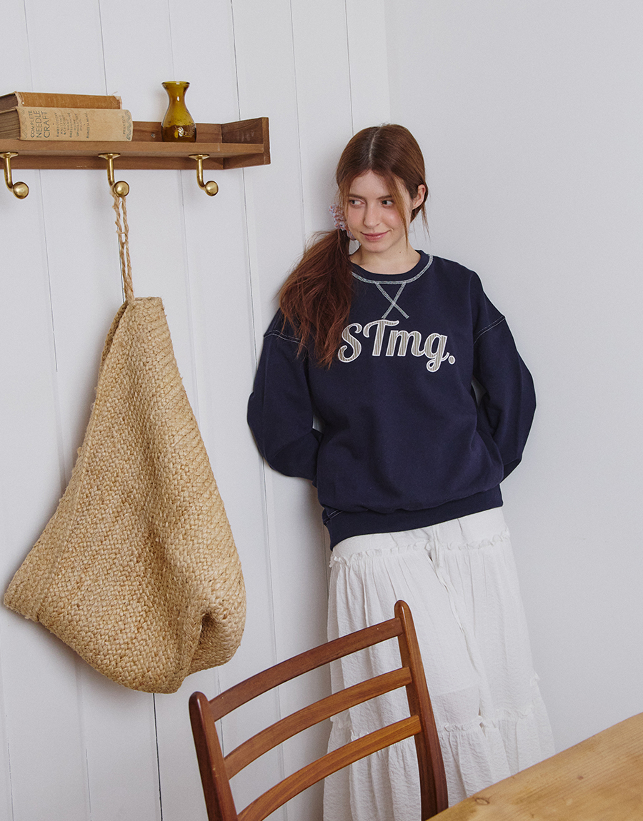 전면에는 STmg. 로고 그래픽을 배치하고, 넥라인과 봉제 라인에는 배색 스티치를 더해 빈티지한 무드를 완성했습니다.