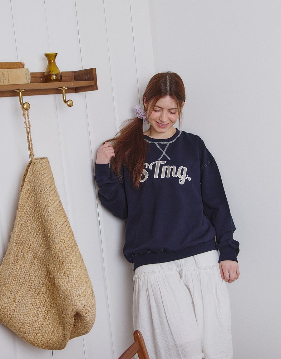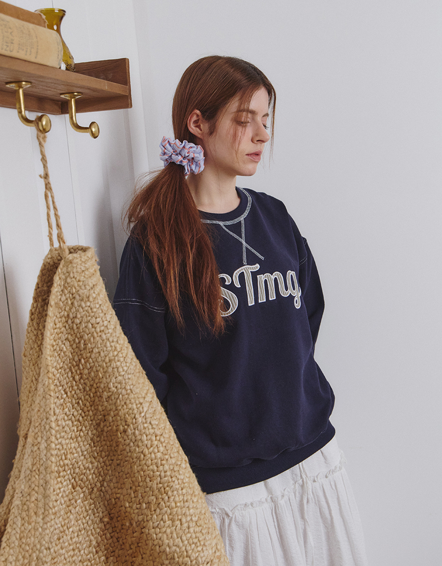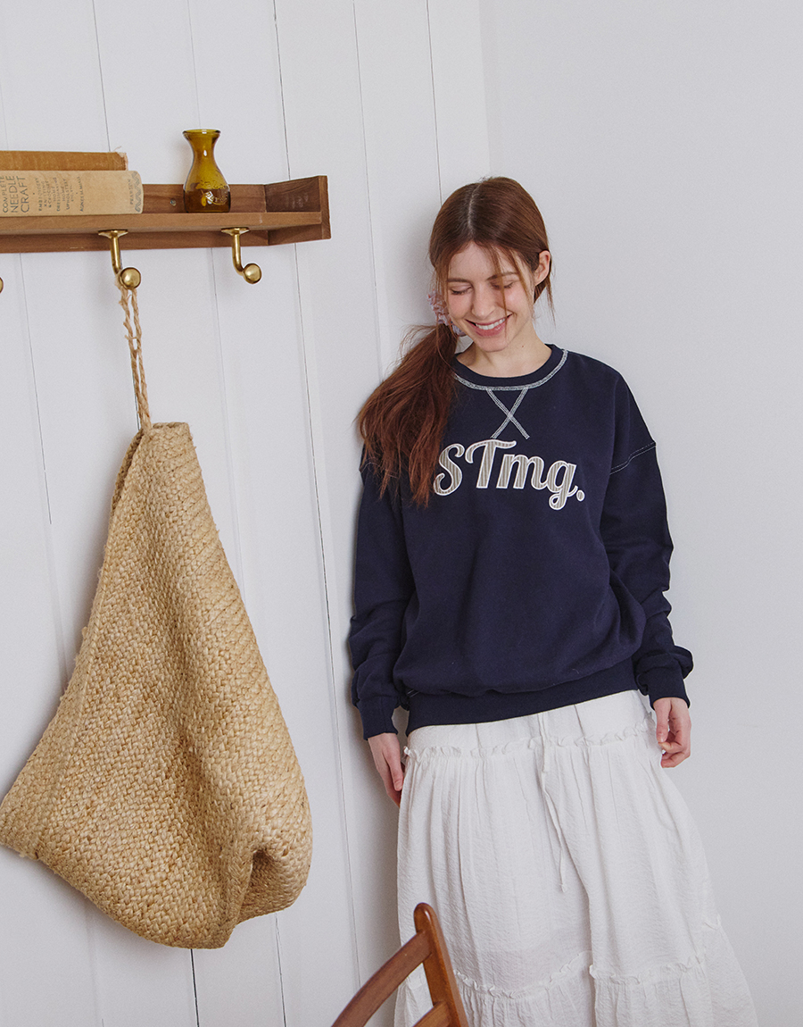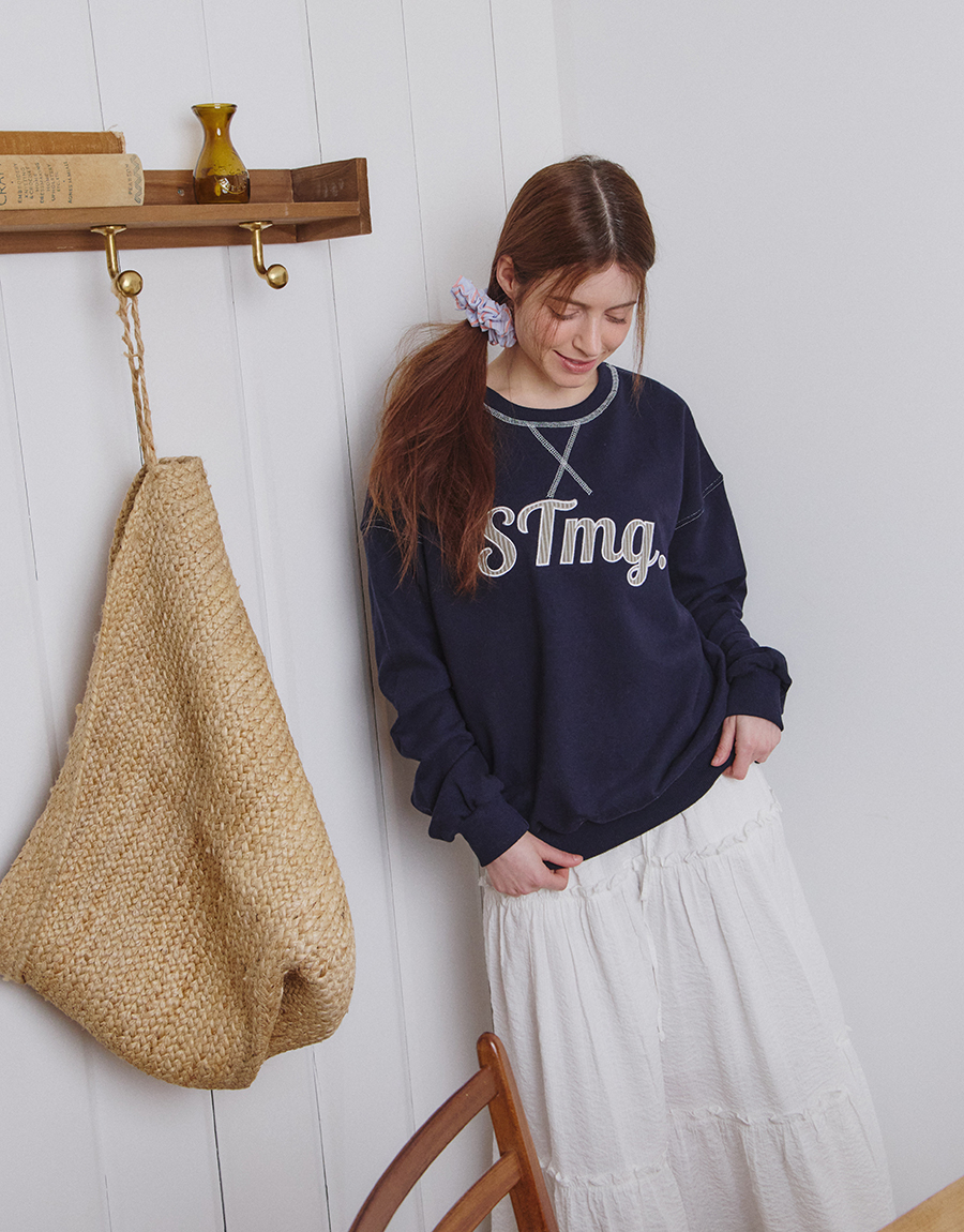 전면에는 STmg. 로고 그래픽을 배치하고, 넥라인과 봉제 라인에는 배색 스티치를 더해 빈티지한 무드를 완성했습니다.