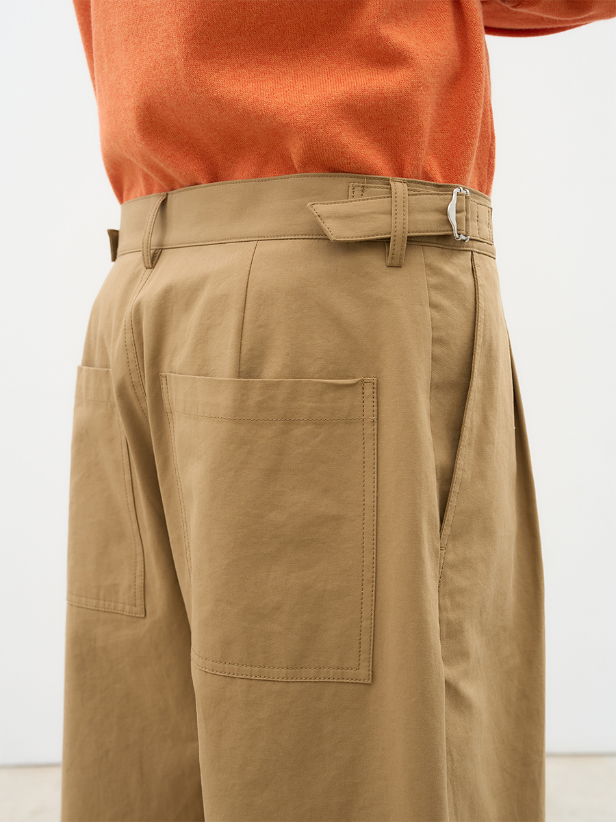 필드 팬츠의 정체성을 계승한 허벅지의 플랩 포켓 디테일과 허리 라인의 자유로운 조절을 돕는 어드저스트 스트랩.