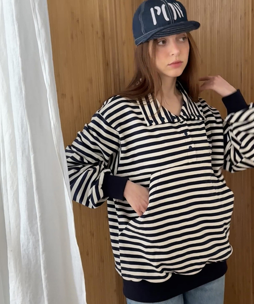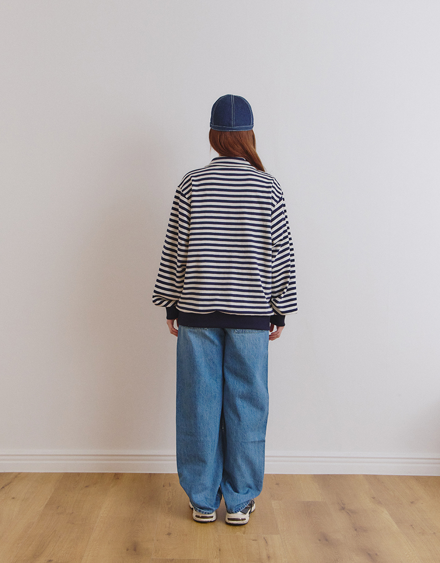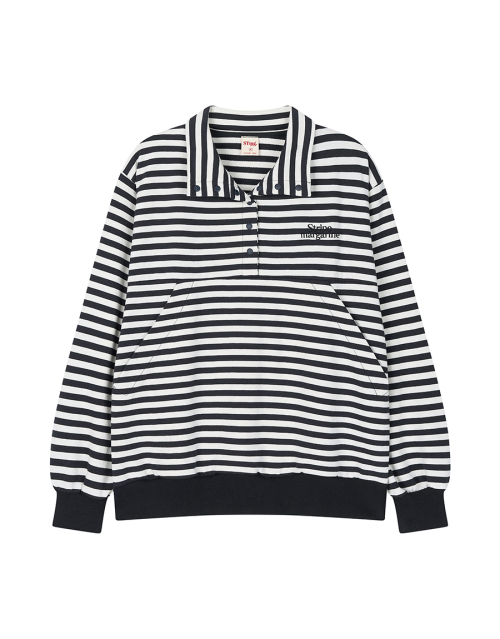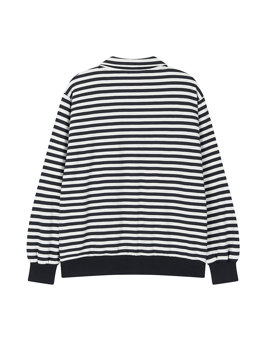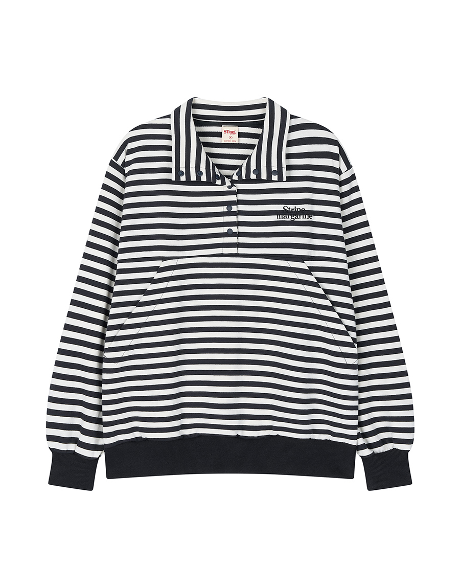 스트라이프 패턴이 돋보이는 하프 스냅 스웨트셔츠입니다.