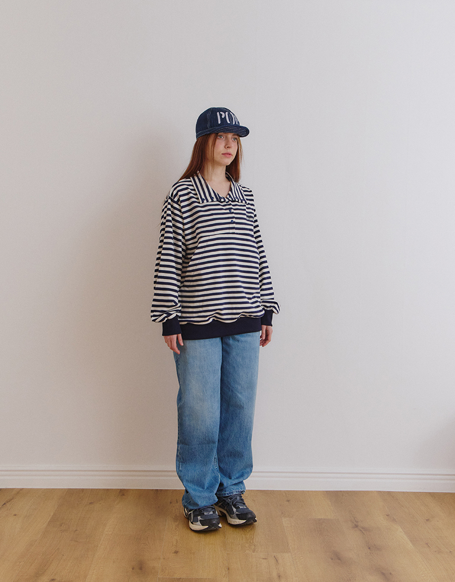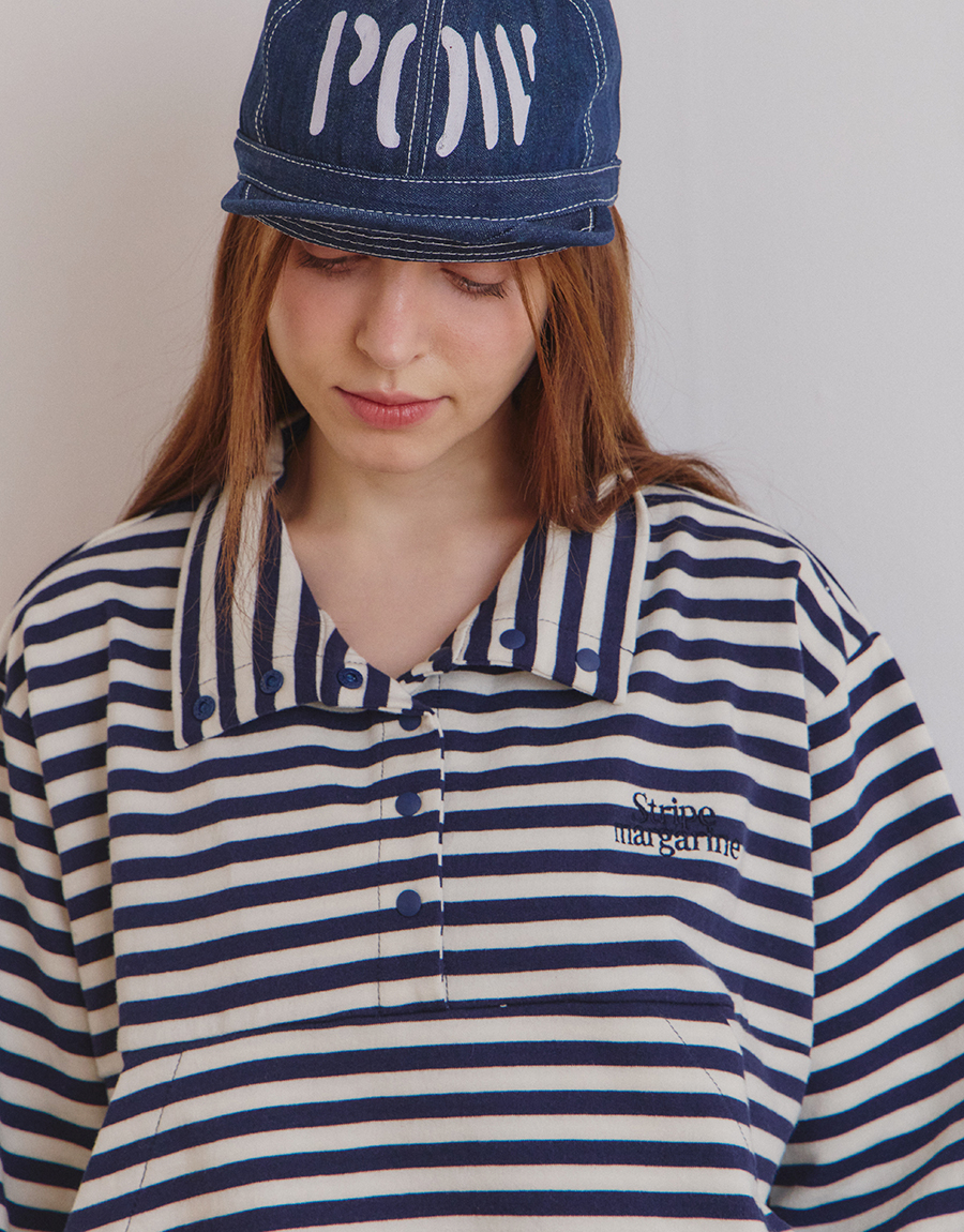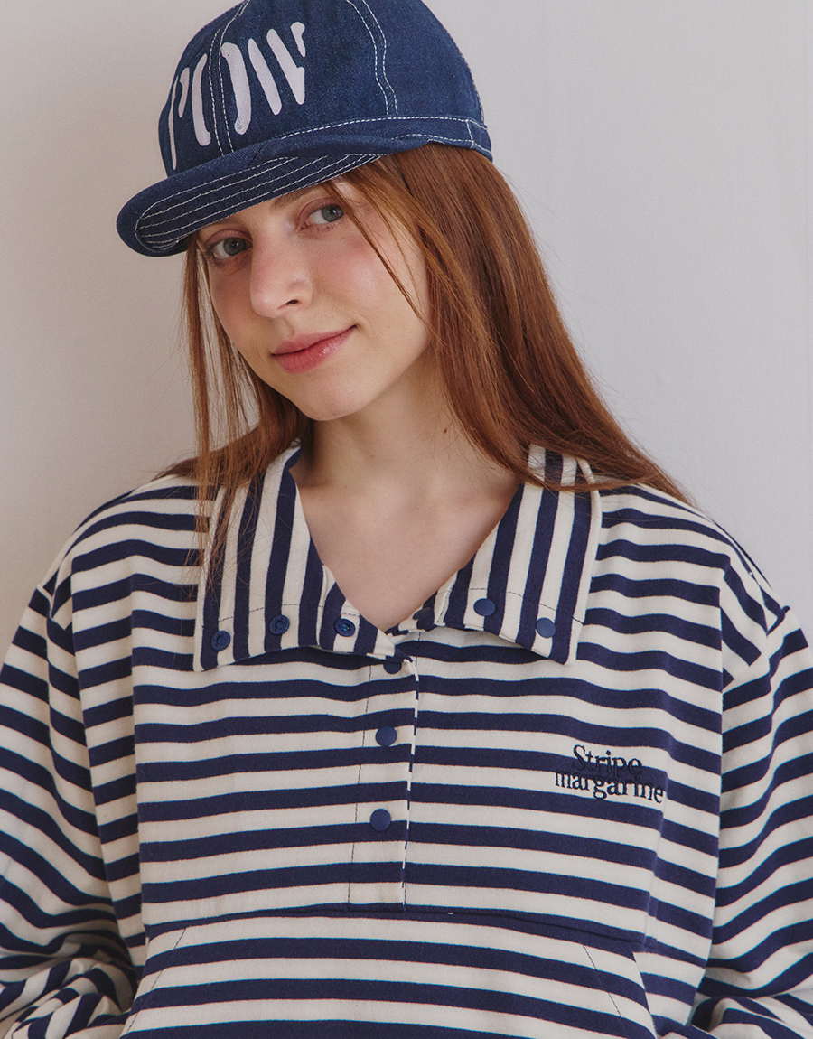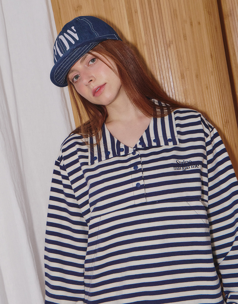 스트라이프 패턴이 돋보이는 하프 스냅 스웨트셔츠입니다.