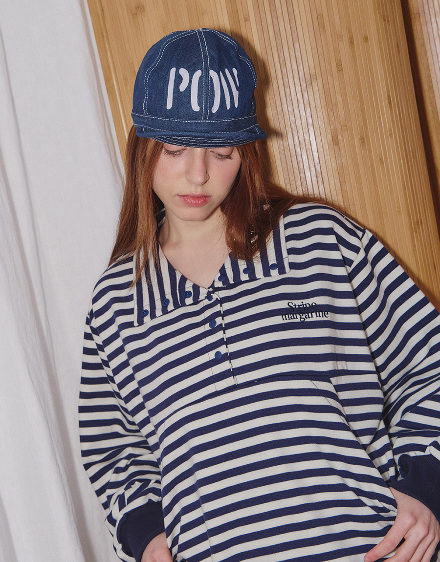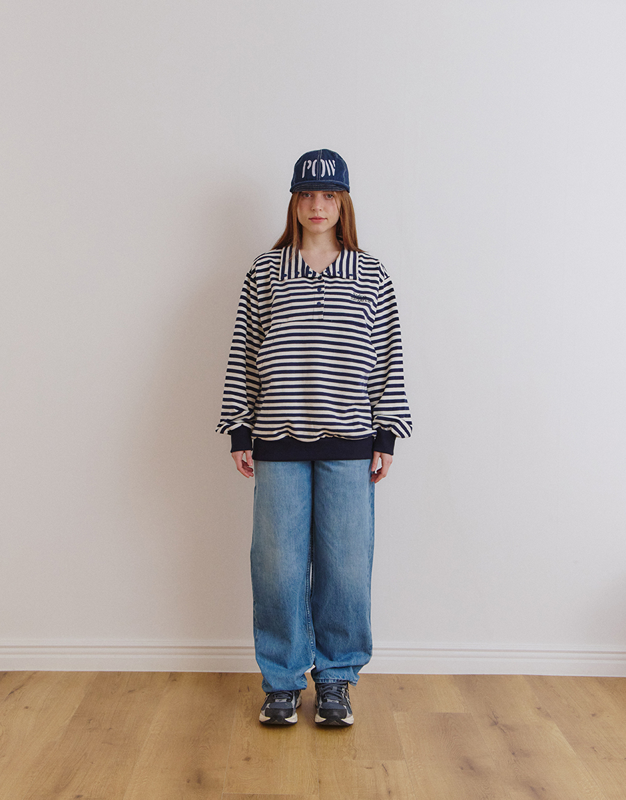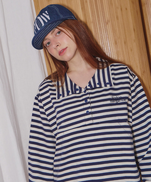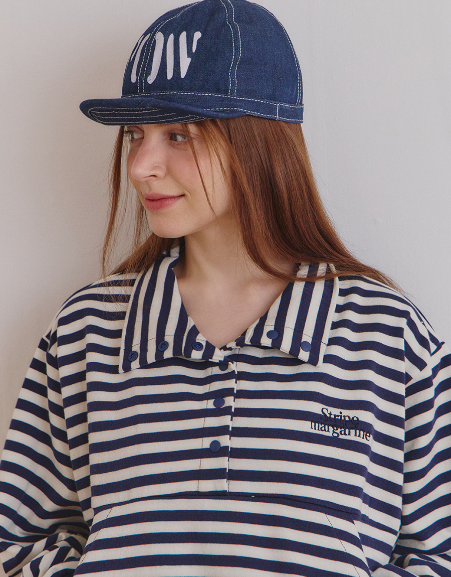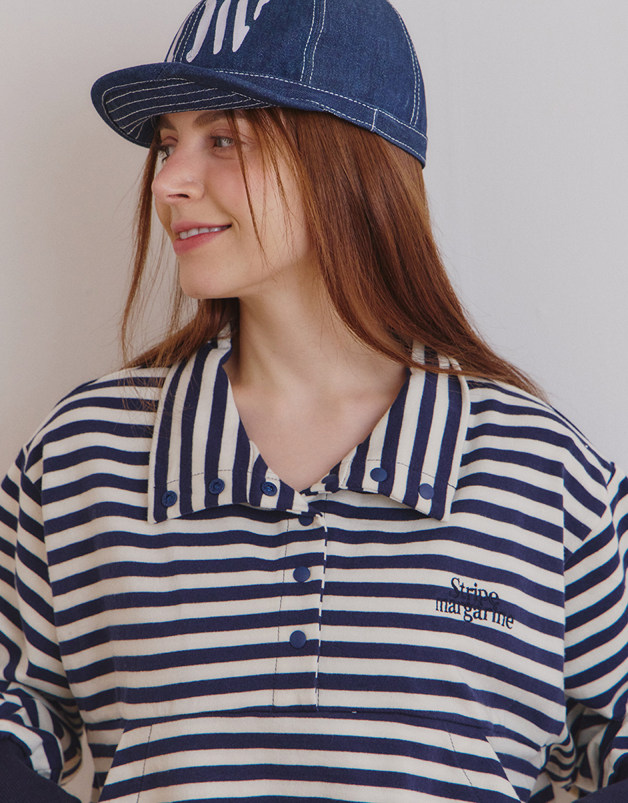 스트라이프 패턴이 돋보이는 하프 스냅 스웨트셔츠입니다.