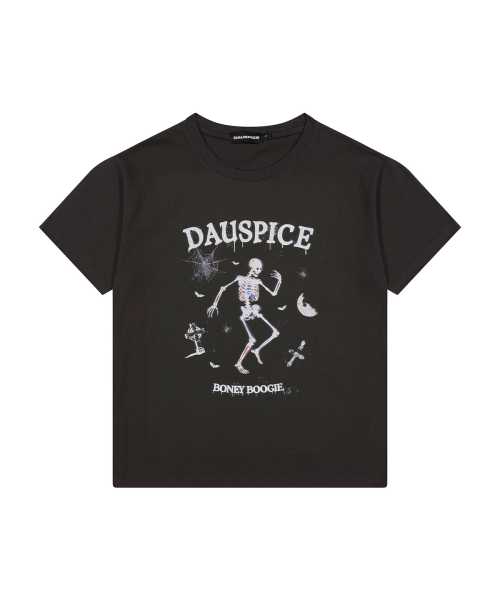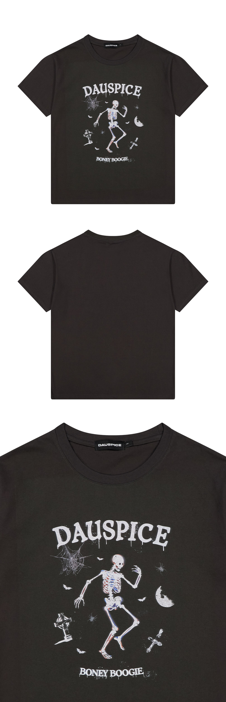 보니부기가 머무는 공동묘지의 풍경에서 영감을 받아 묘비, 십자가, 거미줄 등의 요소를 그래픽으로 풀어낸 오버사이즈 티셔츠입니다.